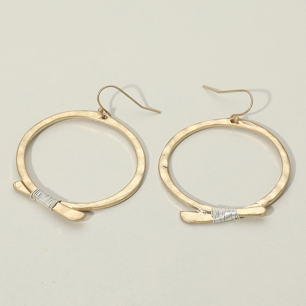 Details • Size : 1.6" X 2" • Fish Hook Back • Sleek hoop earrings featuring a clean circular silhouette accented with a subtle wrapped bar detail for added texture and visual interest. Designed for lightweight comfort and effortless styling, these modern hoops transition easily from casual looks to polished outfits, making them a versatile choice for everyday wear and curated accessory collections. • Lead and Nickel Compliant