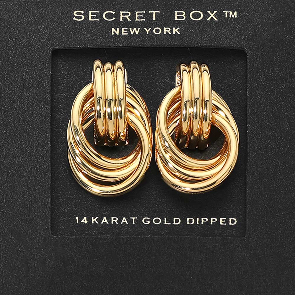 Details • Size : 0.7" X 1" • Post Back • Modern layered knot hoop earrings designed with a bold yet refined silhouette that elevates everyday and evening looks. The interwoven hoop design adds dimension and movement while remaining lightweight and easy to style. A versatile accessory ideal for boutiques seeking statement pieces with timeless appeal. • Gold Dipped