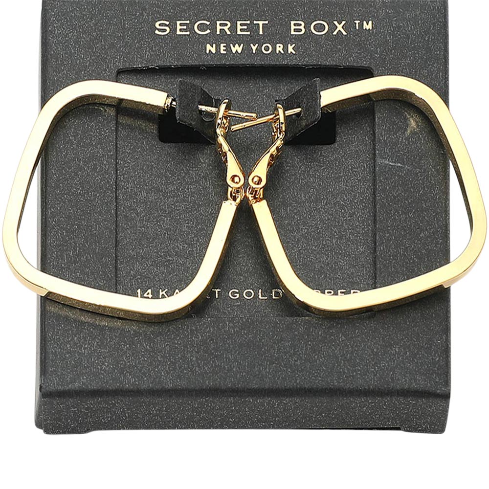 Details • Size : 1.25" X 1.25" • Omega Back • Make a bold statement with these modern geometric hoop earrings featuring a sleek square design. Lightweight yet eye-catching, they add a contemporary touch to both casual and dressy looks. Perfect for fashion-forward styling and everyday elegance. • Gold Dipped