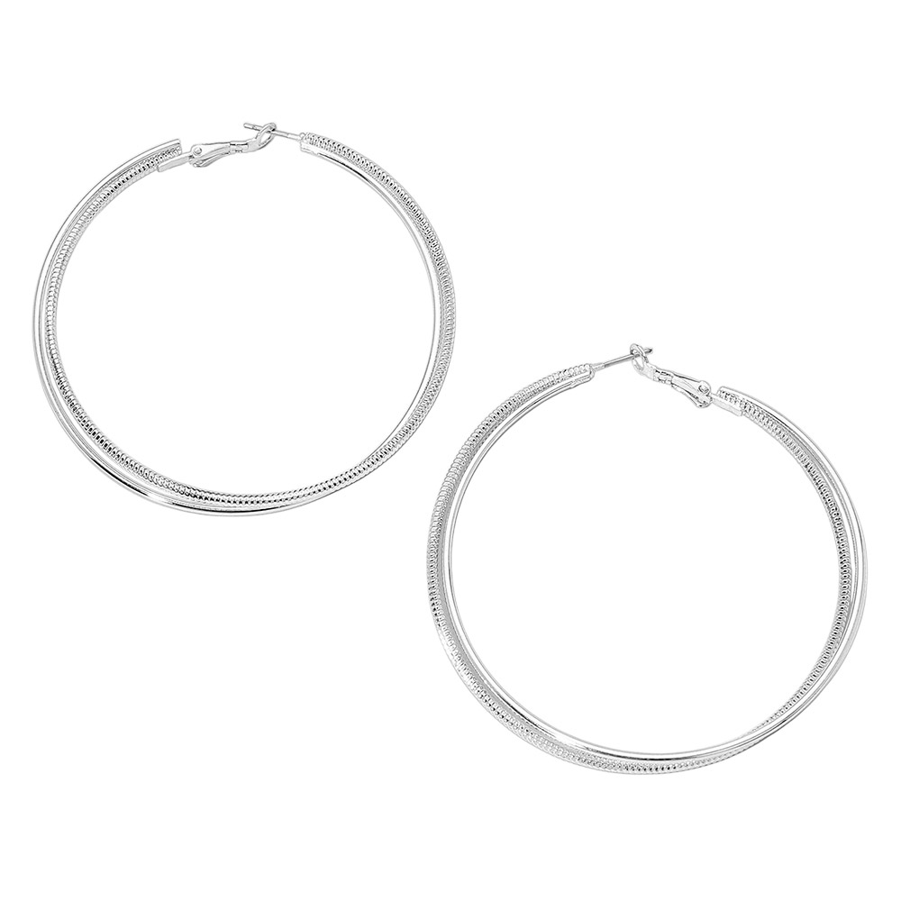 Details • Size : 2.8" X 2.8" • Omega Back • Large textured hoop earrings featuring a detailed outer pattern and smooth inner curve. Lightweight and comfortable with secure latch-back closures, perfect for adding a bold yet refined accent to everyday or dressy looks. • Sterling Silver Dipped • Lead and Nickel Compliant