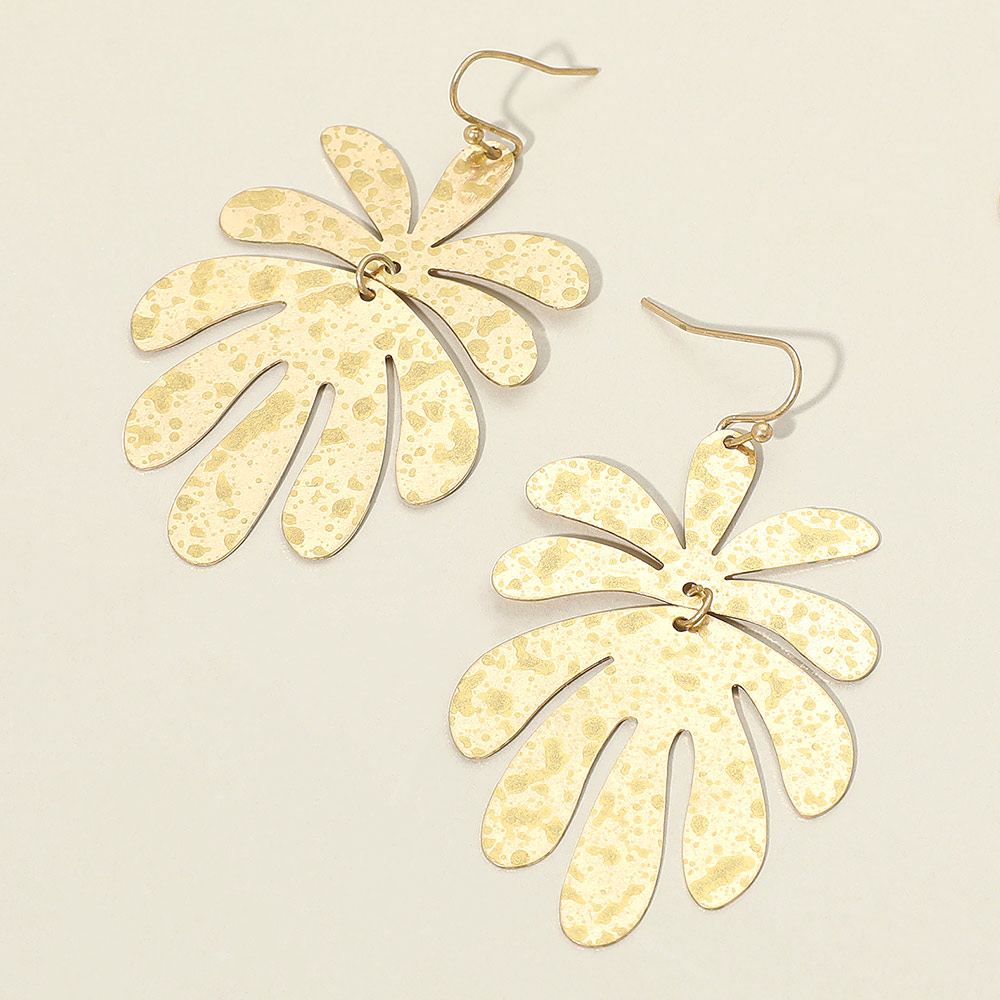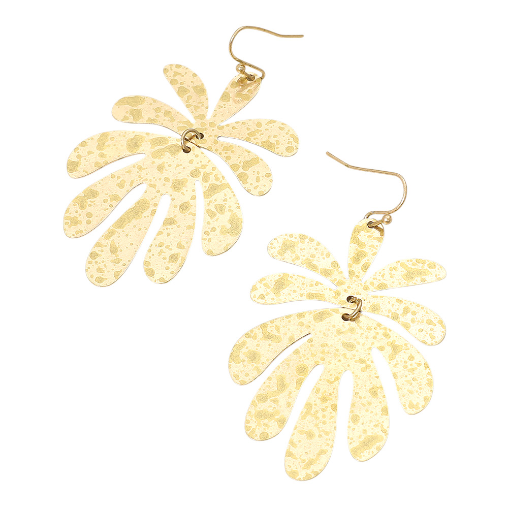 Details • Size : 1.4" X 2.5" • Fish Hook Back • Statement dangle earrings shaped like abstract palm leaves with a hammered texture finish. Lightweight and eye-catching, perfect for adding a bold touch to tropical, casual, or vacation-inspired outfits. • Lead and Nickel Compliant