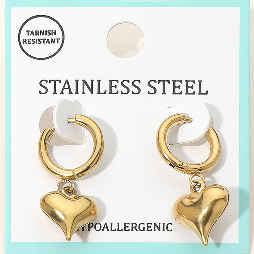 Details • Size : 0.6" X 1.25" • Huggie Back • Charming heart dangle hoop earrings designed to add a playful yet polished touch to everyday looks. The compact hoop silhouette with a smooth heart accent offers easy styling for casual outfits, date nights, or gift-ready moments with timeless appeal. • Hypoallergenic • Lead and Nickel Compliant • Stainless Steel