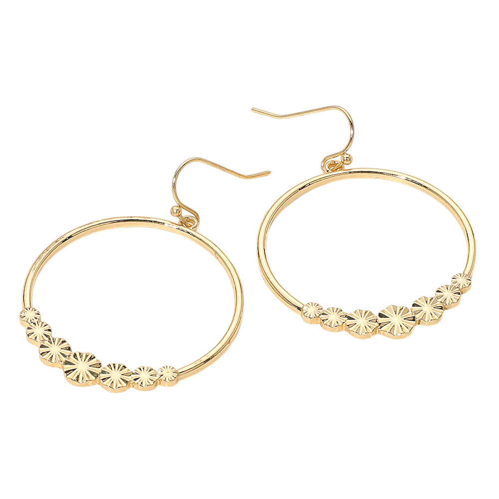 Details • Size : 1.4" X 1.75" • Fish Hook Back • Elegant hoop earrings featuring delicate floral accents for a refined touch. Perfect for adding subtle charm and sophistication to both everyday wear and special occasion outfits. • Lead and Nickel Compliant