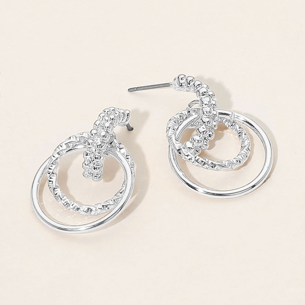 Details • Size : 0.8" X 1.2" • Post Back • Double circle drop earrings featuring a mix of smooth and textured finishes, accented with beaded detailing. Lightweight and stylish, perfect for elevating both everyday wear and special occasion looks with a modern, artistic flair. • Lead and Nickel Compliant