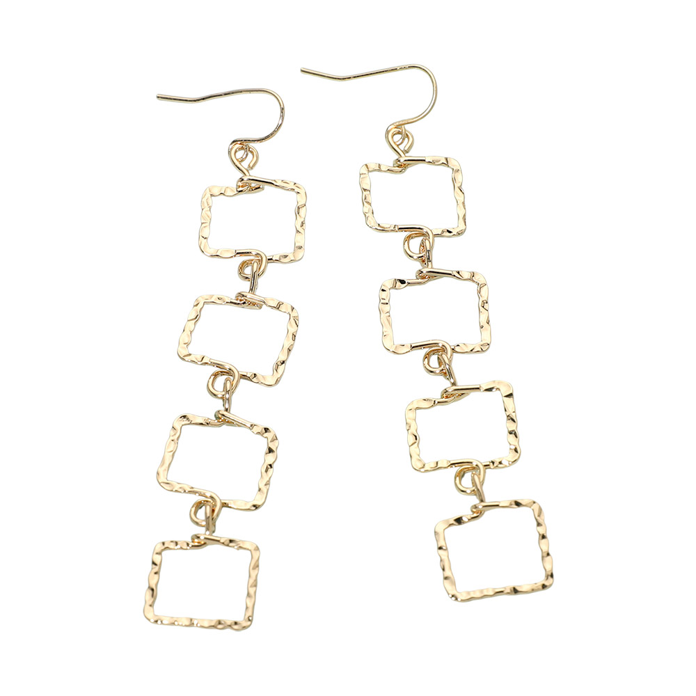 Details • Size : 0.6" X 3.5" • Fish Hook Back • Modern drop earrings featuring a chain of textured square links that create eye-catching movement and a bold yet wearable silhouette. Designed for effortless styling, these earrings transition easily from everyday outfits to evening looks. A versatile, trend-driven accessory perfect for boutiques seeking contemporary statement pieces with a clean, geometric aesthetic. • Lead and Nickel Compliant