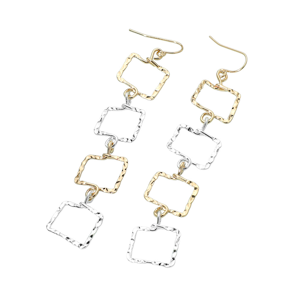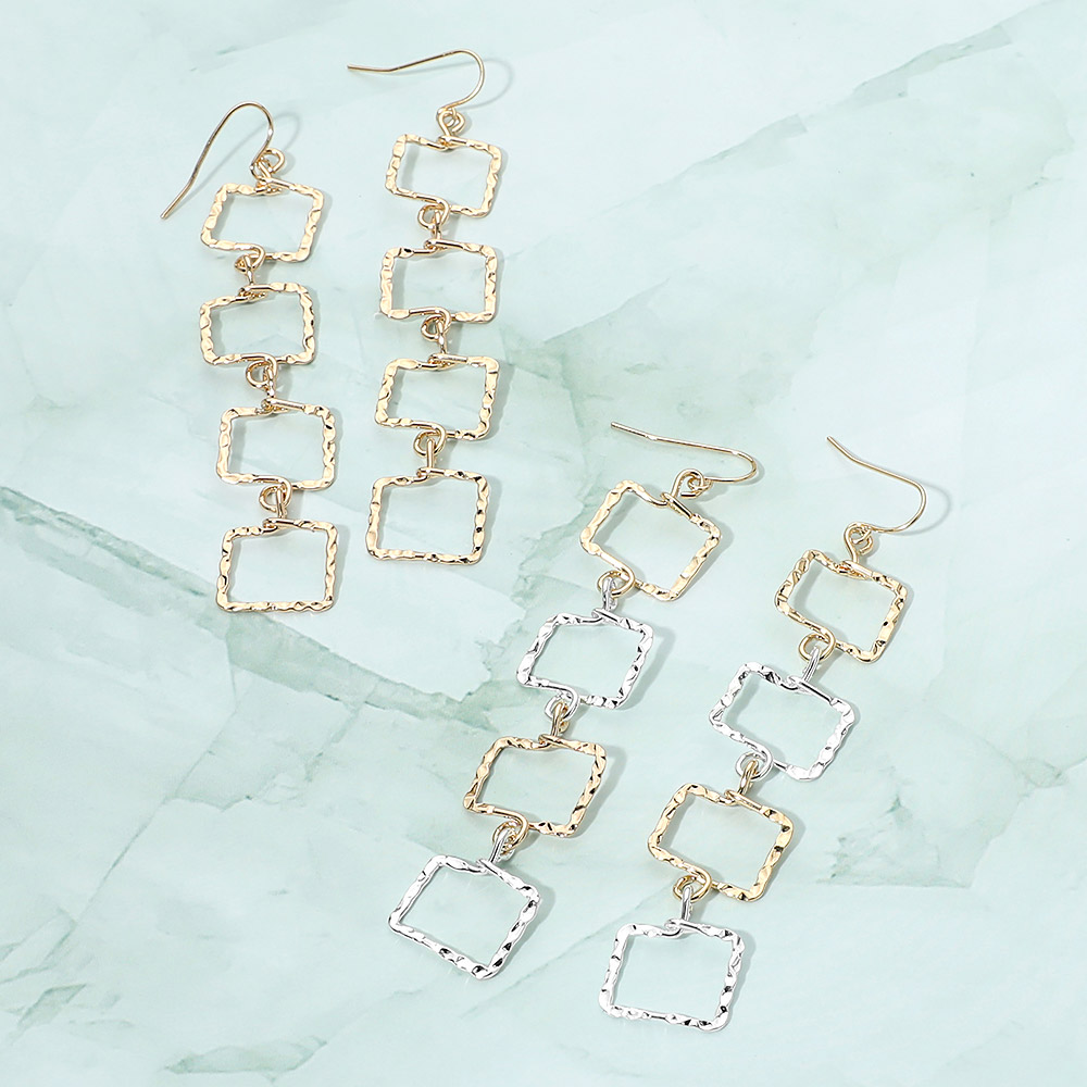 Details • Size : 0.6" X 3.5" • Fish Hook Back • Modern drop earrings featuring a chain of textured square links that create eye-catching movement and a bold yet wearable silhouette. Designed for effortless styling, these earrings transition easily from everyday outfits to evening looks. A versatile, trend-driven accessory perfect for boutiques seeking contemporary statement pieces with a clean, geometric aesthetic. • Lead and Nickel Compliant