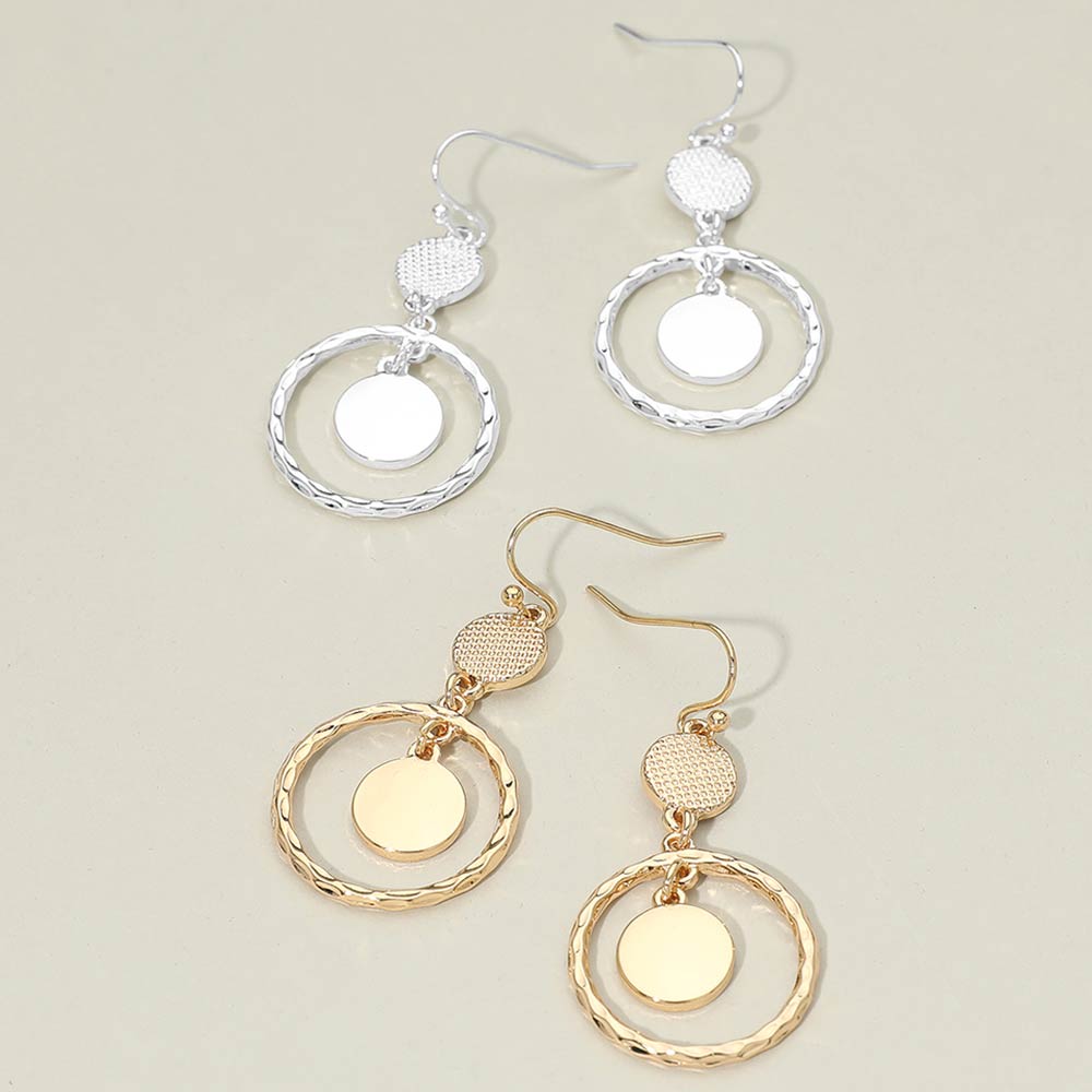 Details • Size : 0.8" X 1.75" • Fish Hook Back • Elevate everyday style with these textured hoop disc drop earrings. Featuring a circular open hoop paired with a smooth hanging disc and a subtle textured top accent, this design adds depth and gentle movement. Lightweight and comfortable, they transition easily from casual wear to work and evening looks. A versatile accessory that complements modern, minimalist, and seasonal collections while offering timeless appeal and effortless styling. • Lead and Nickel Compliant