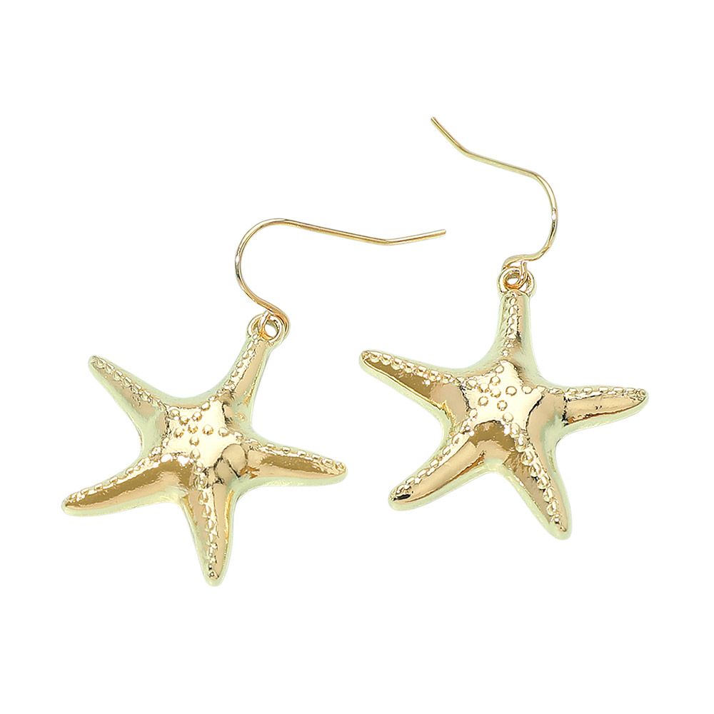 Details • Size : 1" X 1.4" • Fish Hook Back • Playful starfish drop earrings bring a breezy coastal vibe to any outfit with a sculpted five-point design and easy dangle silhouette. Lightweight and versatile, they transition seamlessly from daytime wear to evening looks, adding a charming statement touch to both casual and dressy styles. • Lead and Nickel Compliant