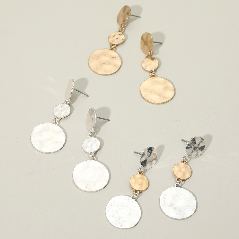 Details • Size : 0.8" X 2.25" • Post Back • Stylish drop earrings featuring layered hammered disc shapes that create organic texture and natural movement. The cascading design offers a modern yet timeless look, making these earrings easy to style with everyday outfits, workwear, or elevated occasions that call for subtle statement jewelry. • Lead and Nickel Compliant