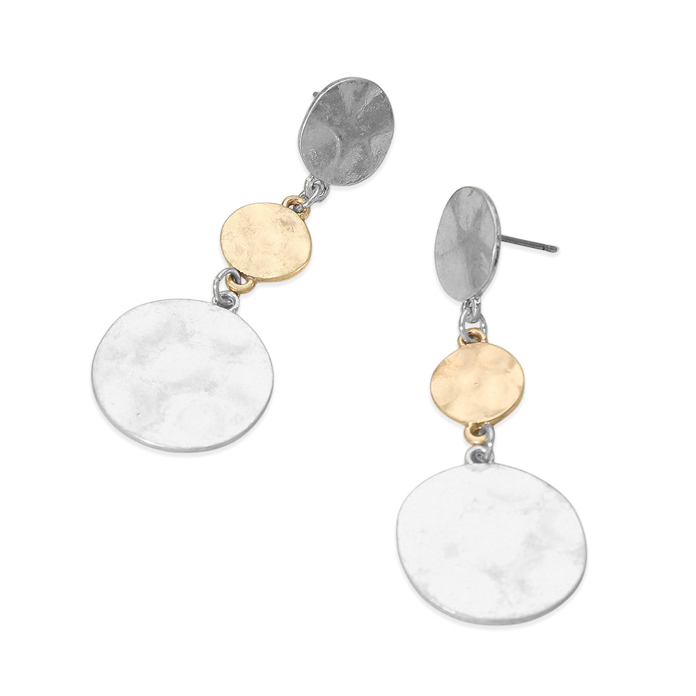 Details • Size : 0.8" X 2.25" • Post Back • Stylish drop earrings featuring layered hammered disc shapes that create organic texture and natural movement. The cascading design offers a modern yet timeless look, making these earrings easy to style with everyday outfits, workwear, or elevated occasions that call for subtle statement jewelry. • Lead and Nickel Compliant