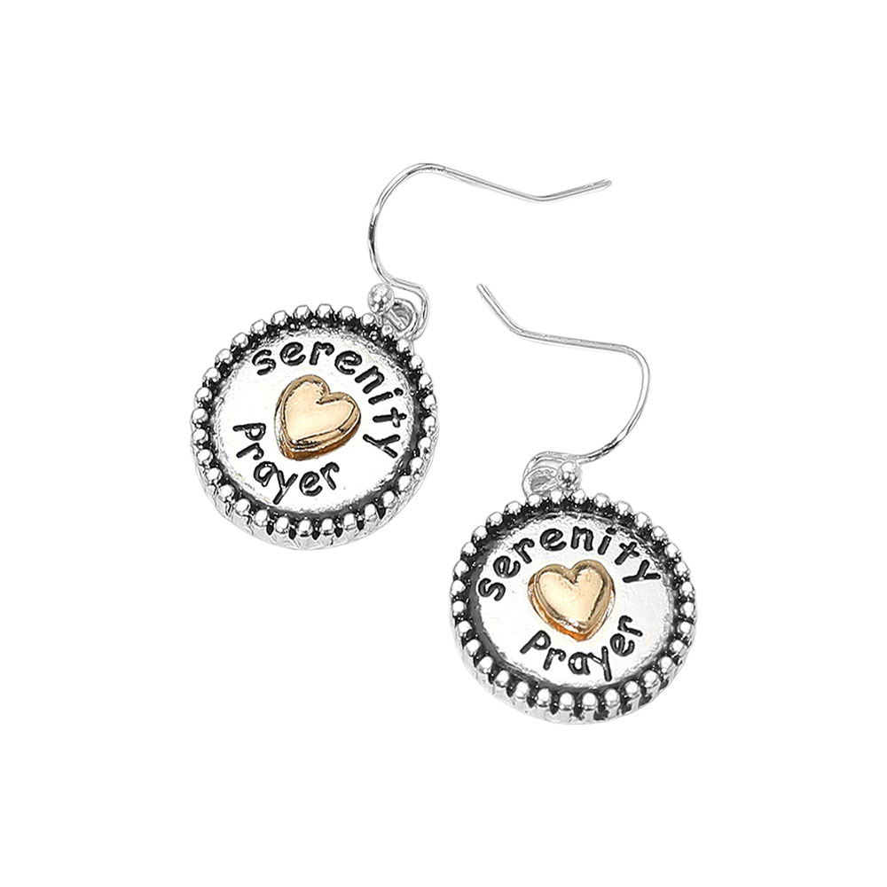 Details • Size : 0.75" X 1.25" • Fish Hook Back • Find peace and strength with these Serenity Prayer earrings, designed with a heartfelt charm and golden heart accent. A beautiful reminder of faith and hope, these earrings are perfect for daily wear or as a meaningful gift for loved ones seeking encouragement and inspiration. • Lead and Nickel Compliant