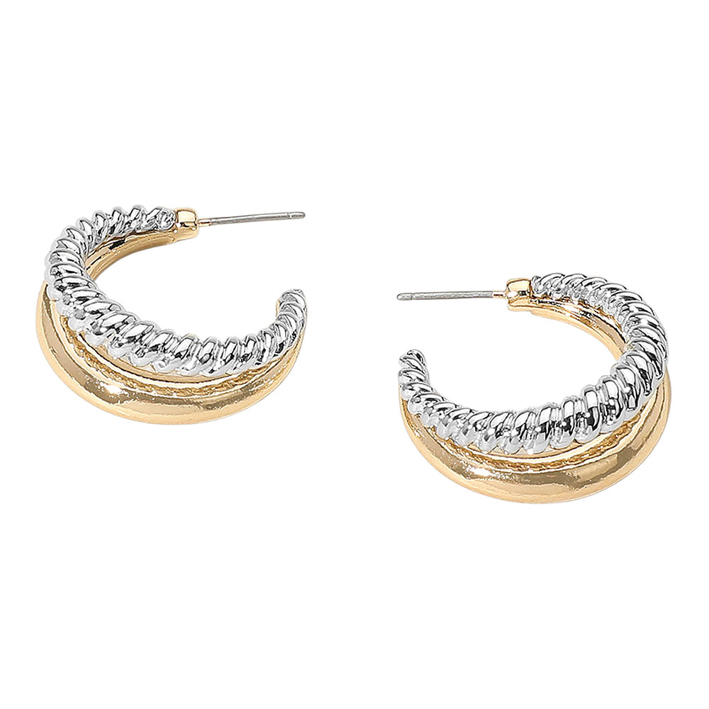 Details • Size : 1" X 1" X 0.5" • Post Back • Add a modern twist to your look with these textured dual-tone hoop earrings. Their elegant blend of smooth and braided detailing brings dimension and shine, making them a perfect accessory for both everyday wear and sophisticated evening styles. • Lead and Nickel Compliant
