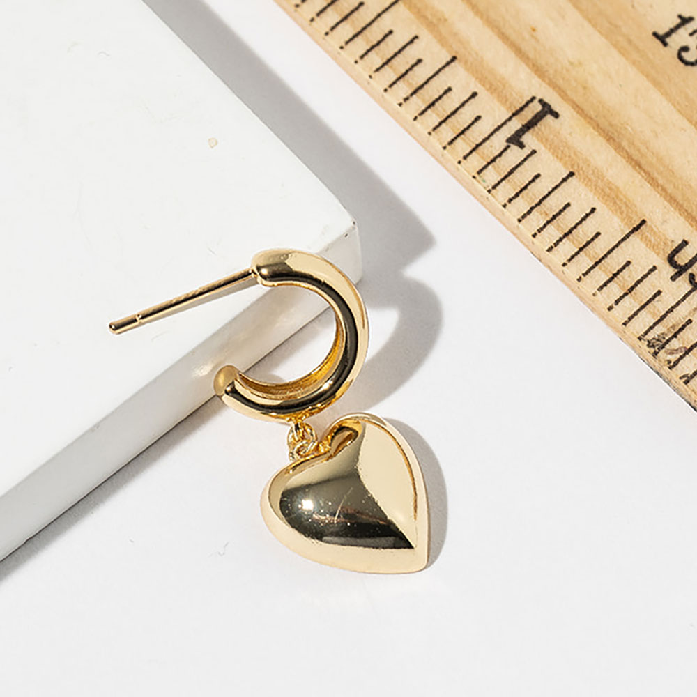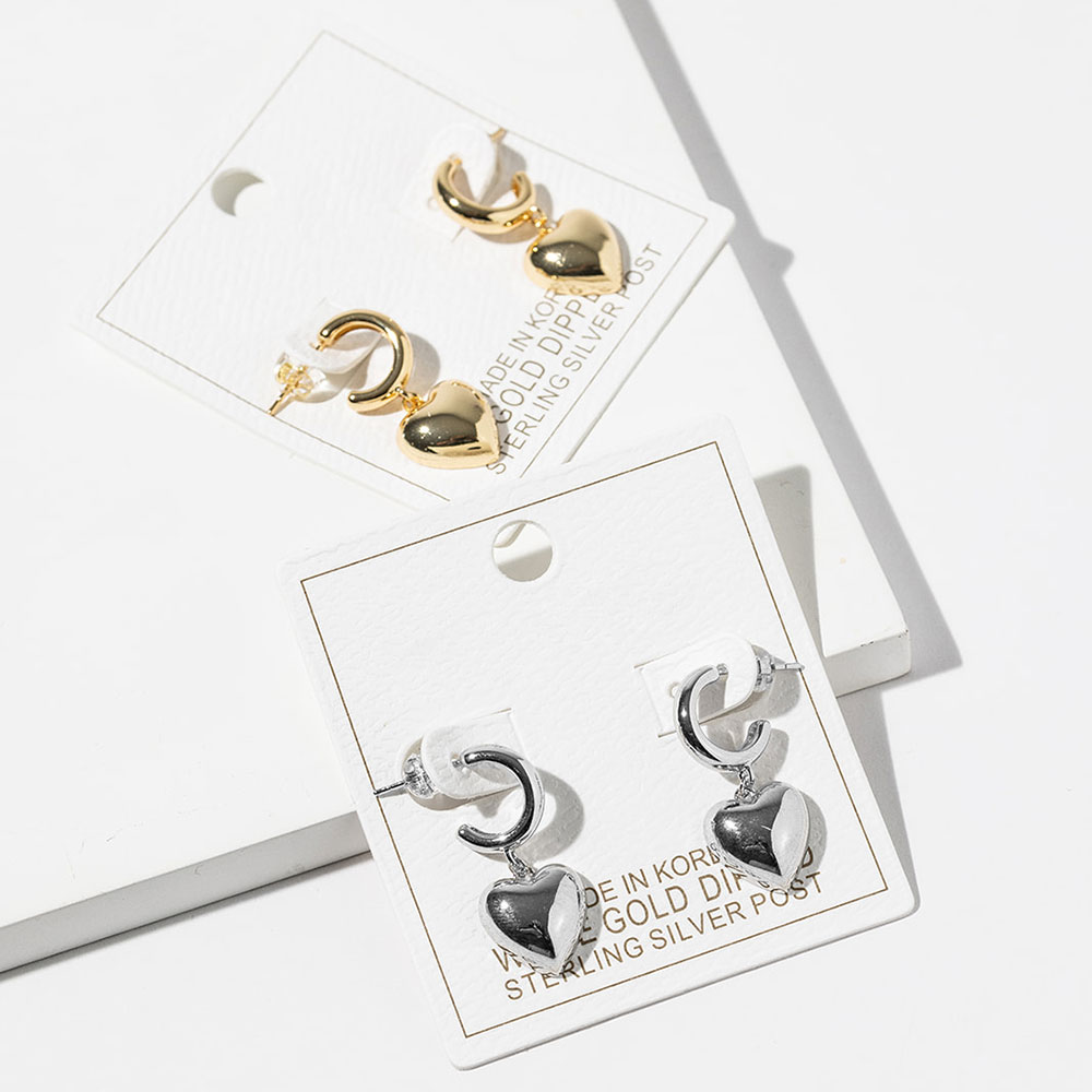 Details • Size : 0.5" X 1.1" • Modern hoop earrings featuring a smooth heart-shaped drop that adds playful charm and subtle movement. Designed to elevate everyday outfits and occasion looks alike, this versatile style appeals to trend-driven shoppers seeking romantic accents with a clean, contemporary silhouette. • Gold Dipped • Lead and Nickel Compliant • Made In Korea • Sterling Silver Post