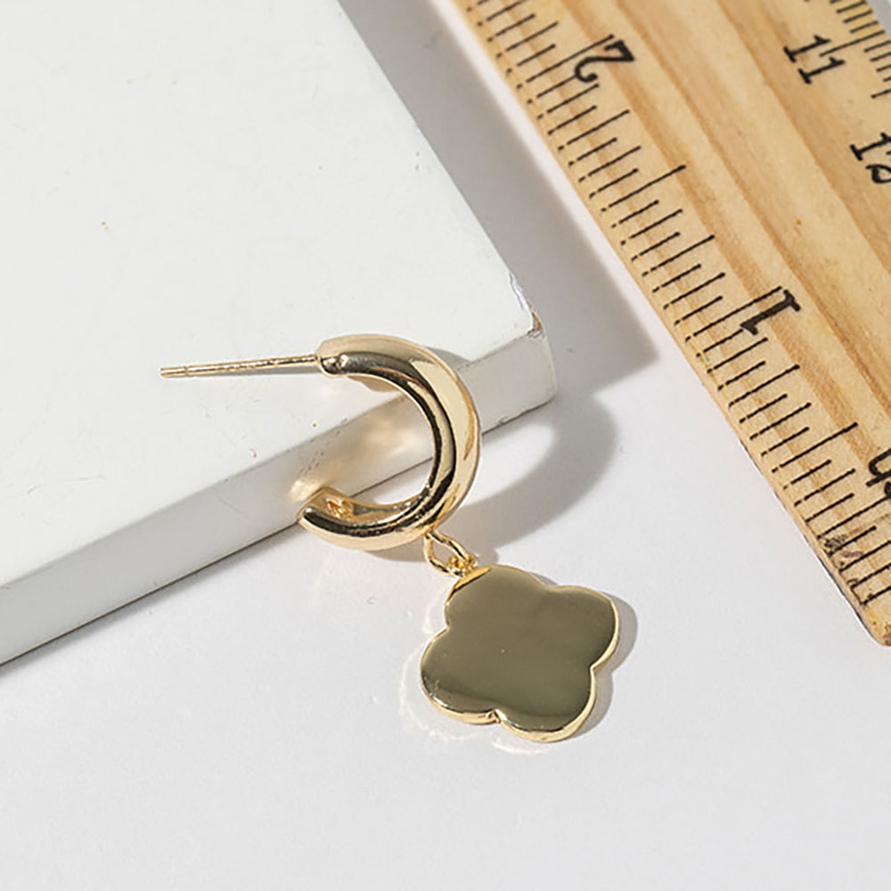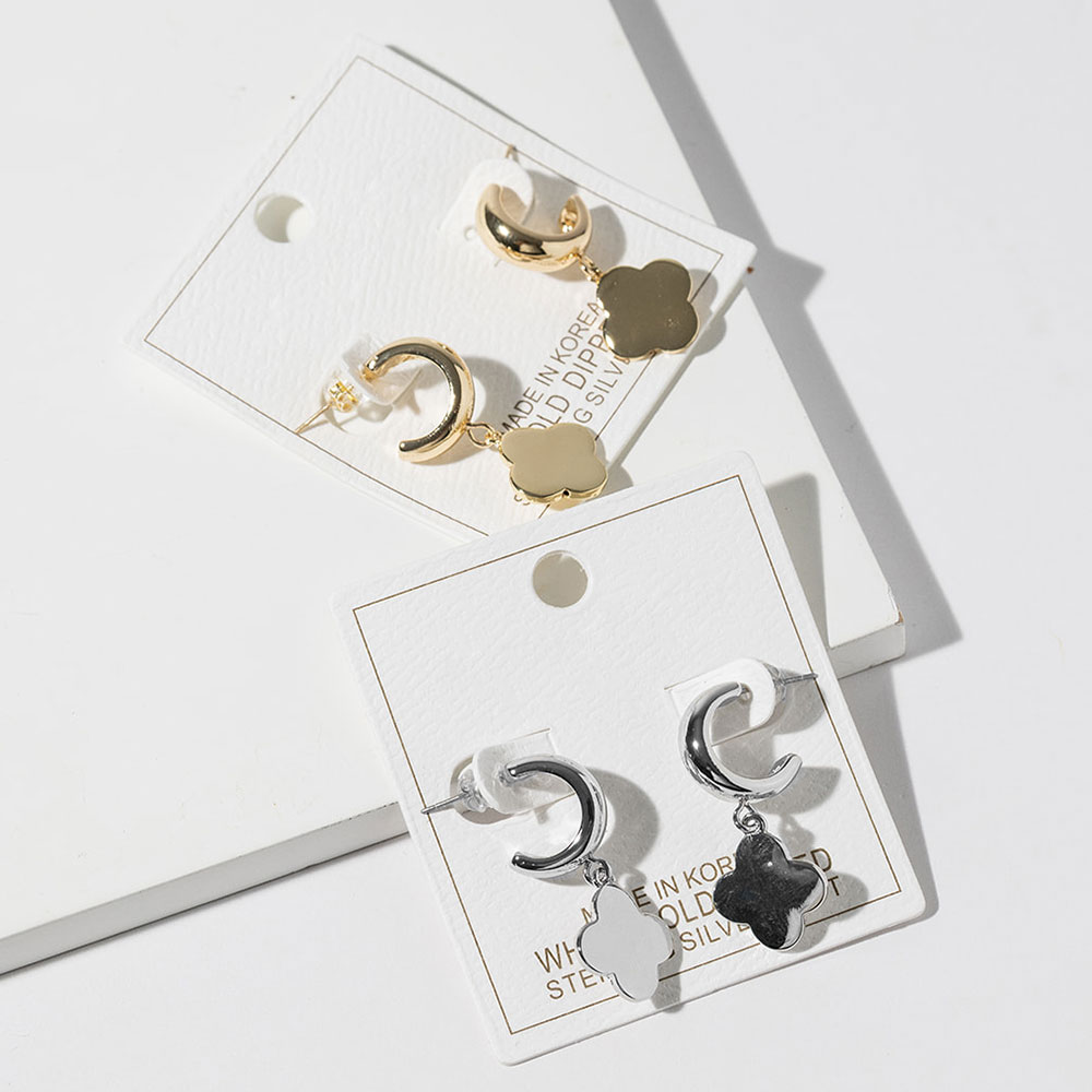 Details • Size : 0.6" X 1.2" • Chic hoop drop earrings featuring a sleek quatrefoil charm silhouette for a polished, everyday-to-evening look. Designed to elevate casual outfits or complement dressy styles, these earrings offer a timeless accent ideal for gifting, seasonal collections, or effortless accessorizing. • Gold Dipped • Lead and Nickel Compliant • Made In Korea • Sterling Silver Post