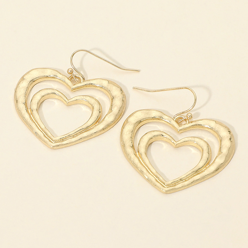 Details • Size : 1.3" X 1.5" • Fish Hook Back • Romantic double heart drop earrings featuring layered open heart silhouettes with a softly sculpted finish. Designed to add movement and charm, these lightweight earrings offer an easy hook style that works for everyday outfits, date nights, or seasonal gifting displays. Perfect for boutique jewelry collections. • Lead and Nickel Compliant