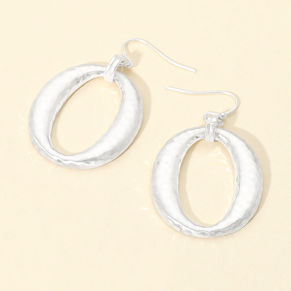 • Modern oval drop earrings with a softly hammered texture that adds depth and dimension without extra weight. Designed with an open silhouette and classic hook closure, these earrings offer effortless movement and versatility for everyday wear, work looks, and seasonal boutique collections. Perfect for minimalist and contemporary jewelry assortments.