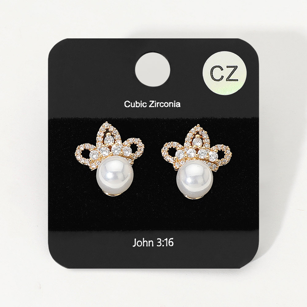 Pearl Accented CZ Embellished Crown Stud Evening Earrings