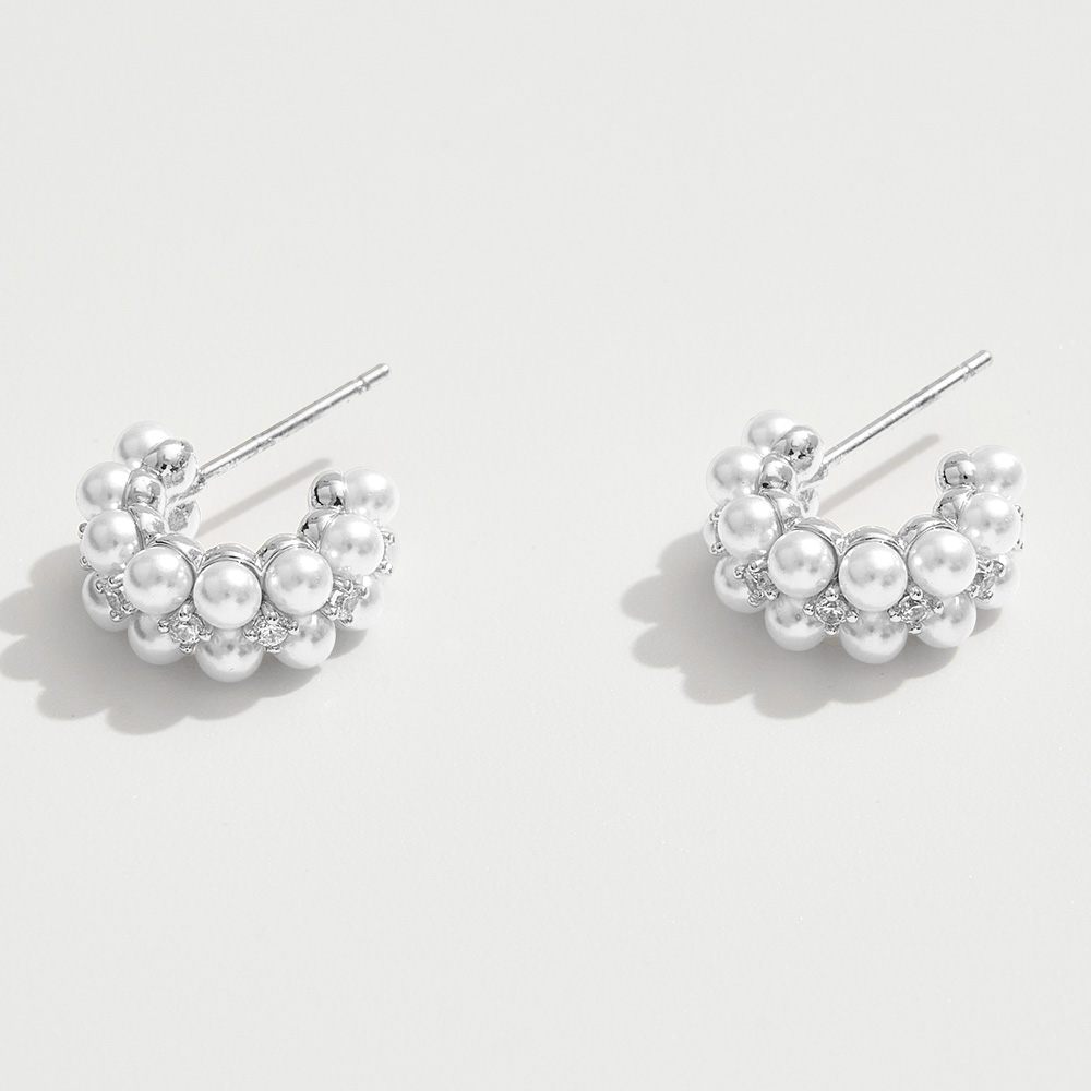 Details • Size : 0.6" X 0.5" X 0.25" • Post Back • Cluster huggie earrings adorned with luminous pearls and sparkling accents for a refined yet modern look. Their elegant design brings effortless sophistication, making them the perfect choice for elevating casual styles or completing special occasion outfits. • Brass • Gold Dipped • Hypoallergenic • Lead and Nickel Compliant • Made In Korea