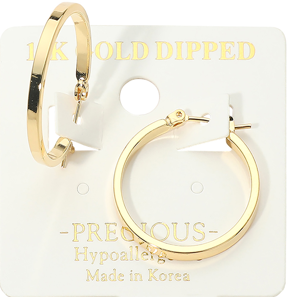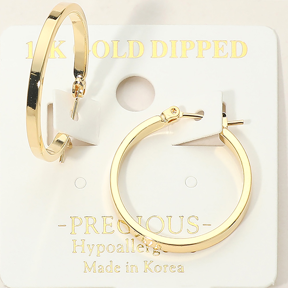 Details • Size : 1" X 1" • Pin Catch • These slim flat hoop earrings feature a clean, modern profile with a smooth polished finish for a refined everyday look. Designed with a secure latch closure, they provide easy wear and a reliable fit. A versatile essential that transitions effortlessly from casual styling to elevated outfits. • Gold Dipped • Hypoallergenic • Made In Korea