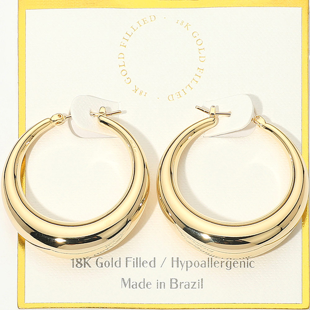 Details • Size : 1.5" X 1.5" • Pin Catch • Water Resistant and Tarnish Free • These bold hoop earrings feature a wide, rounded design that makes a striking statement while staying versatile for both casual and formal looks. Lightweight and hypoallergenic, they offer all-day comfort and a chic finish, perfect for enhancing everyday or evening outfits. • Lead and Nickel Compliant • Hypoallergenic • Gold Filled • Made In Brazil