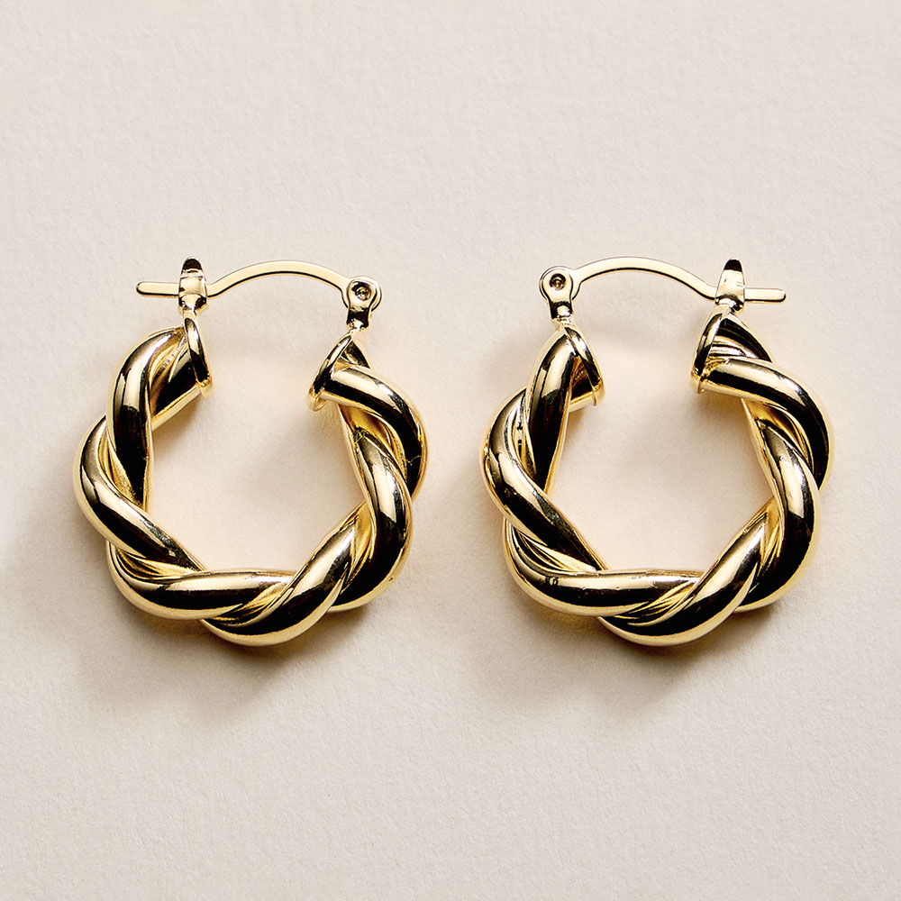 Details • Size : 1" X 1" X 0.2" • Pin Catch • Twisted hoop earrings featuring an intertwined rope-inspired design that adds texture and dimension to a classic silhouette. The rounded shape delivers a bold yet balanced look, perfect for everyday wear or elevated styling. A versatile statement piece ideal for layering, gifting, or completing modern and timeless outfits. • Gold Filled • Hypoallergenic • Lead and Nickel Compliant • Made In Brazil