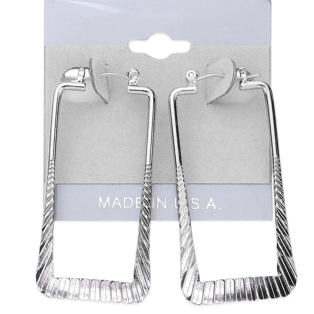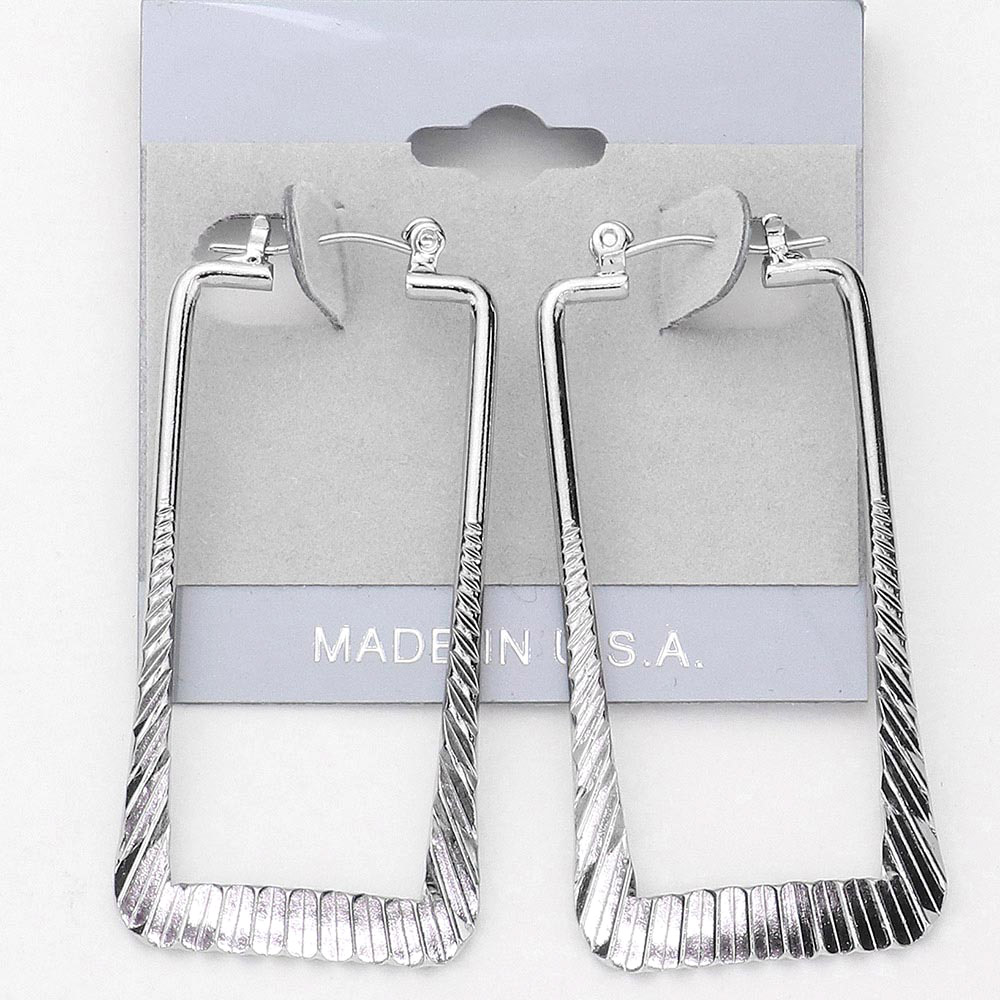Details • Size : 1" X 2" • Pin Catch • Made In USA • Elevate your look with textured square hoop earrings featuring bold lines and a modern angular silhouette. Their unique ribbed detailing adds dimension and style, making them a perfect statement piece for both everyday outfits and special occasions.