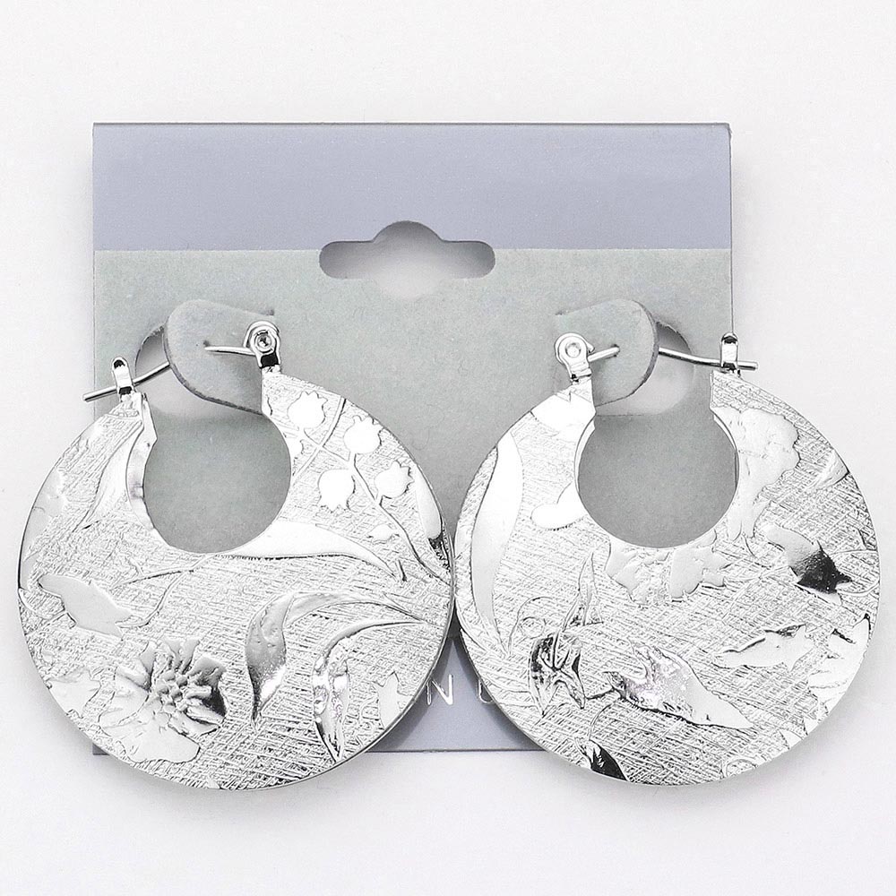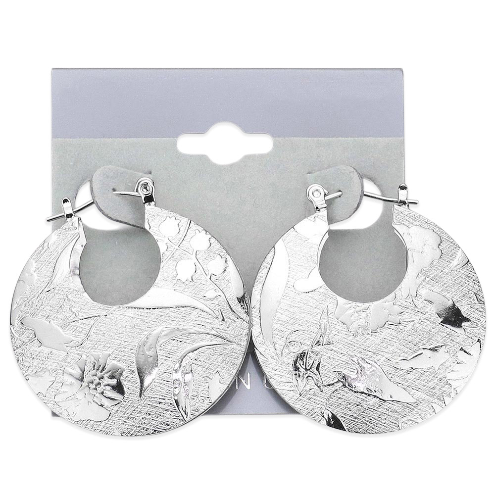 Details • Size : 1.4" L • Pin Catch • Made In USA • Elevate your style with floral engraved disc hoop earrings showcasing a round silhouette and intricate etched details. Their elegant design combines timeless beauty with modern appeal, making them the perfect accessory for both casual wear and evening outfits.
