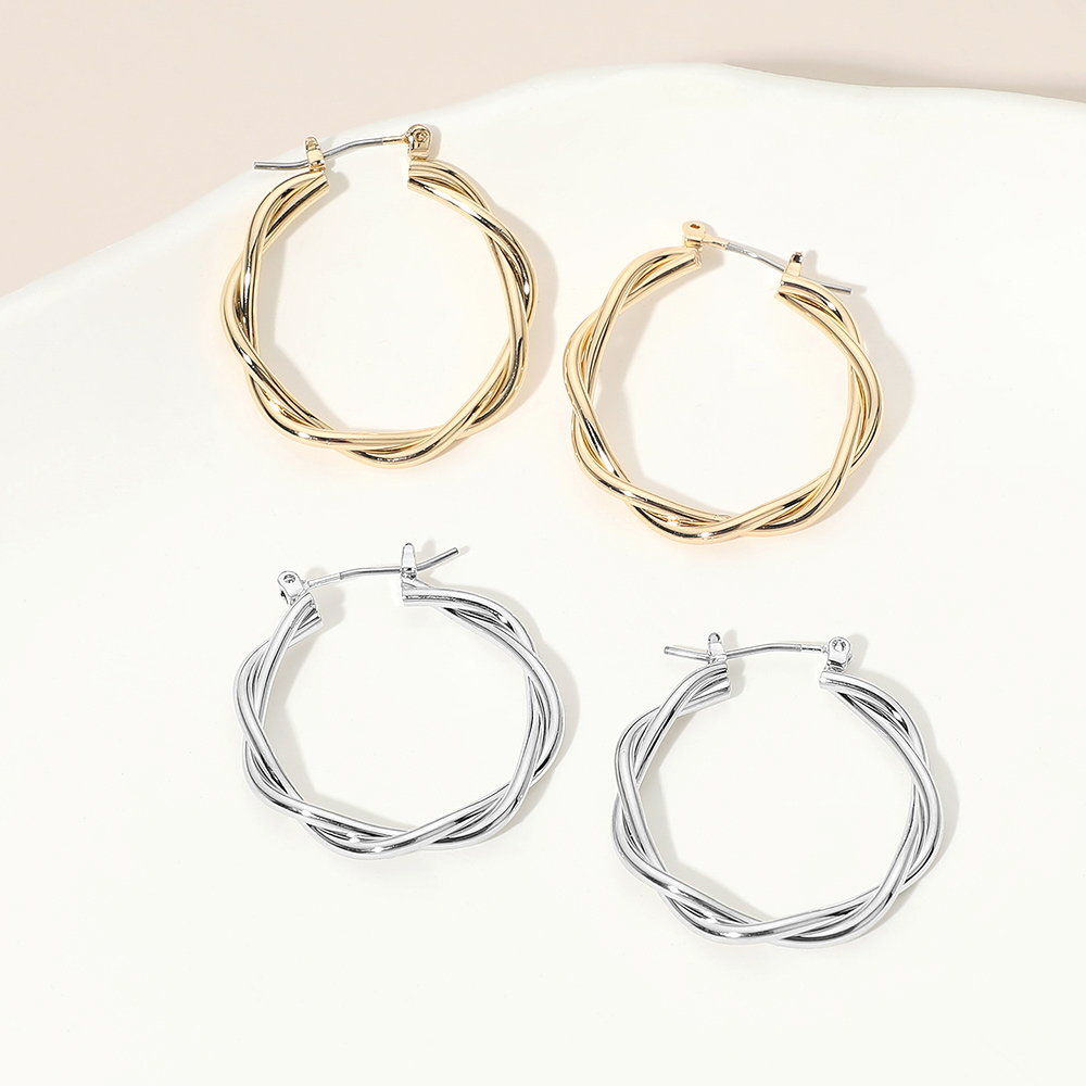 • Sleek twisted hoop earrings featuring a sculpted circular silhouette that adds refined dimension to any outfit. Designed for comfortable everyday wear and effortless styling, these hoops transition easily from casual looks to elevated occasions, making them a versatile staple for boutique jewelry collections and gifting selections.