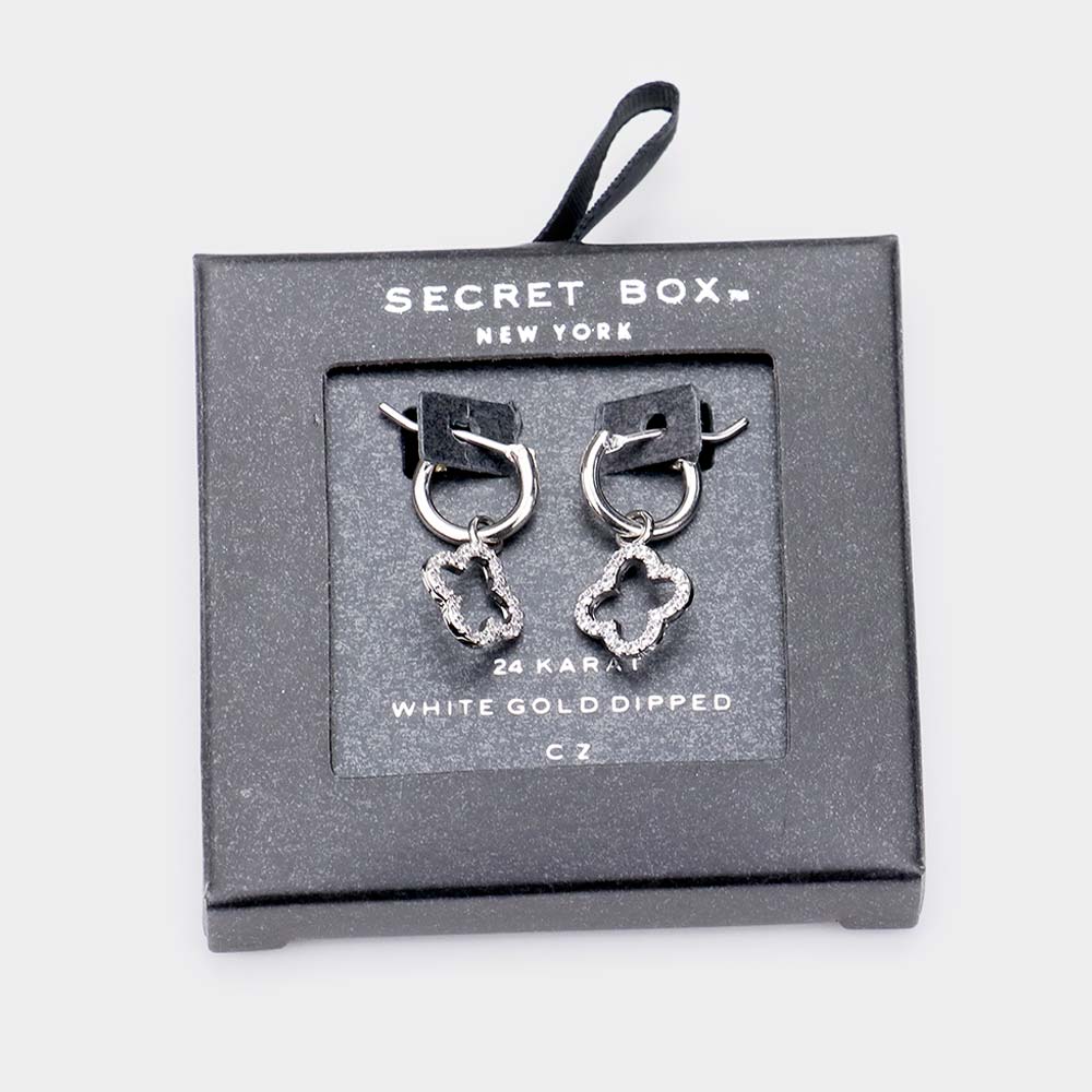 Secret_Box - 24K White Gold Dipped CZ Clover Drop Pin Catch Earrings