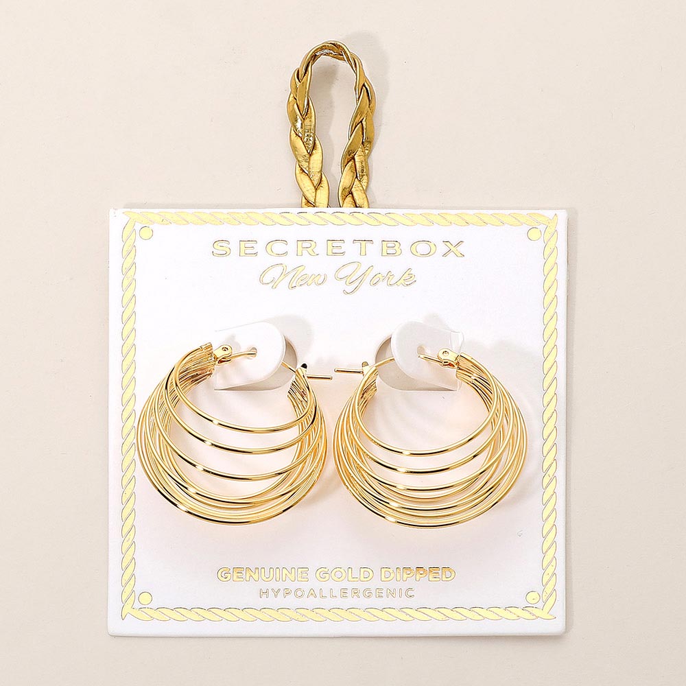 Details • Size : 1.25" X 1.25" X 0.6" • Pin Catch • Discover stylish multi-hoop earrings designed with a modern layered look. These hypoallergenic pieces feature a sleek dipped finish and versatile statement design, perfect for everyday wear or dressing up. Lightweight, comfortable, and beautifully bold for any occasion. • Hypoallergenic • Gold Dipped