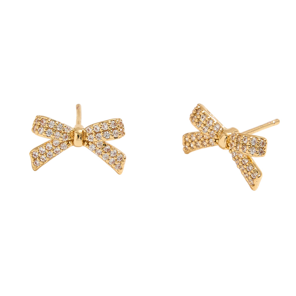 Details • Size : 0.6" X 0.3" • Post Back • These crystal bow stud earrings bring a sparkling, feminine touch to any outfit. Designed with shimmering stones in a delicate bow silhouette, they’re perfect for both casual and dressy occasions, adding elegance and charm to your jewelry collection. • Brass • CZ Cubic Zirconia • Gold Dipped • Lead and Nickel Compliant • Made In Korea