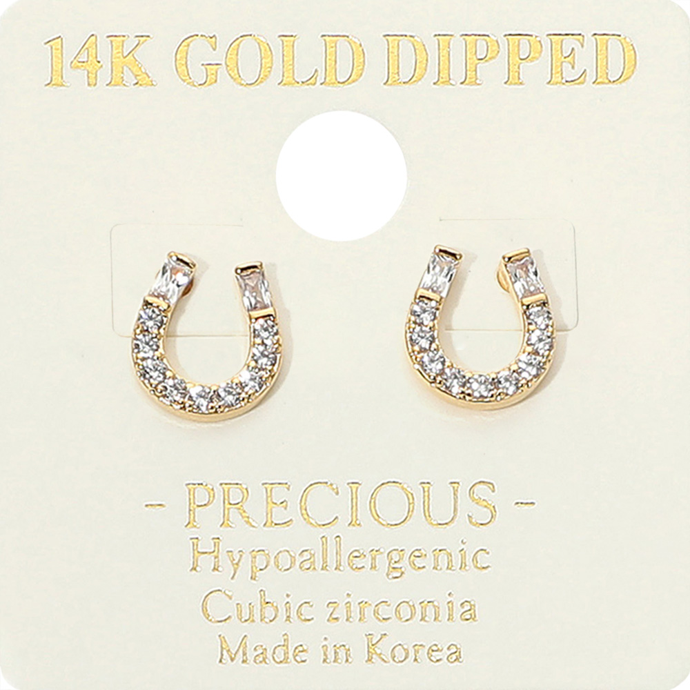 Details • Size : 0.3" X 0.3" • Post Back • Charming horseshoe stud earrings embellished with sparkling cubic zirconia for a radiant finish. A symbol of luck and elegance, these earrings are perfect for daily wear or gifting, adding a touch of shine and sophistication to any jewelry collection. • CZ Cubic Zirconia • Gold Dipped • Hypoallergenic • Made In Korea