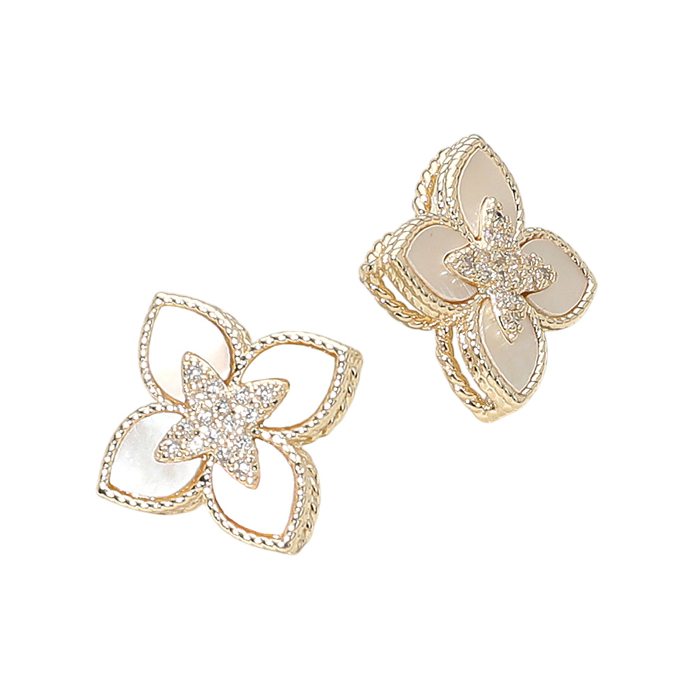 14K Gold Plated CZ Stone Paved Center Mother of Pearl Floral Clover Stud Earrings 14K Gold Plated CZ Stone Paved Center Mother of Pearl Floral Clover Stud Earrings