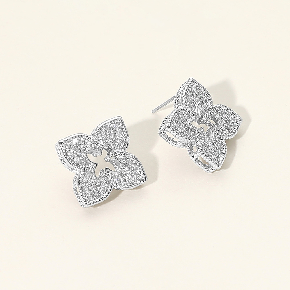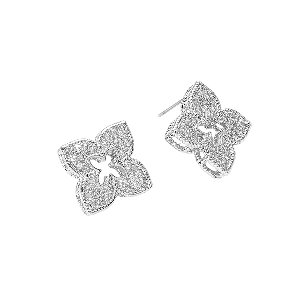 Details • Size : 0.75" X 0.75" • Post Back • Chic stud earrings featuring an open clover silhouette adorned with shimmering cz crystal accents. These elegant earrings bring a refined sparkle to any look, perfect for adding a touch of sophistication to both everyday wear and special occasions. • Gold Dipped • CZ Cubic Zirconia
