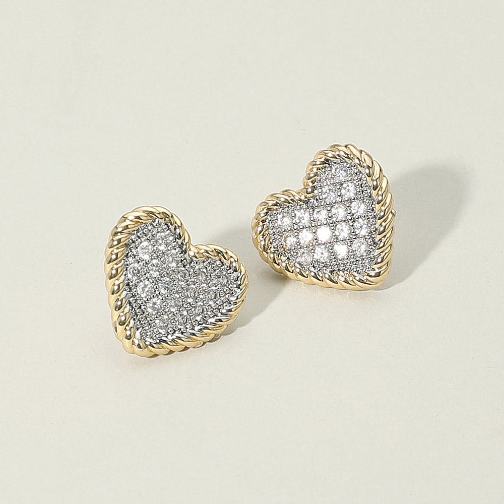 • Shimmer with elegance in these heart stud earrings, encrusted with dazzling pavĂ© crystals and framed by a bold twisted edge. A romantic yet timeless design, perfect for everyday wear or gifting someone special. A sparkling addition to any jewelry collection.