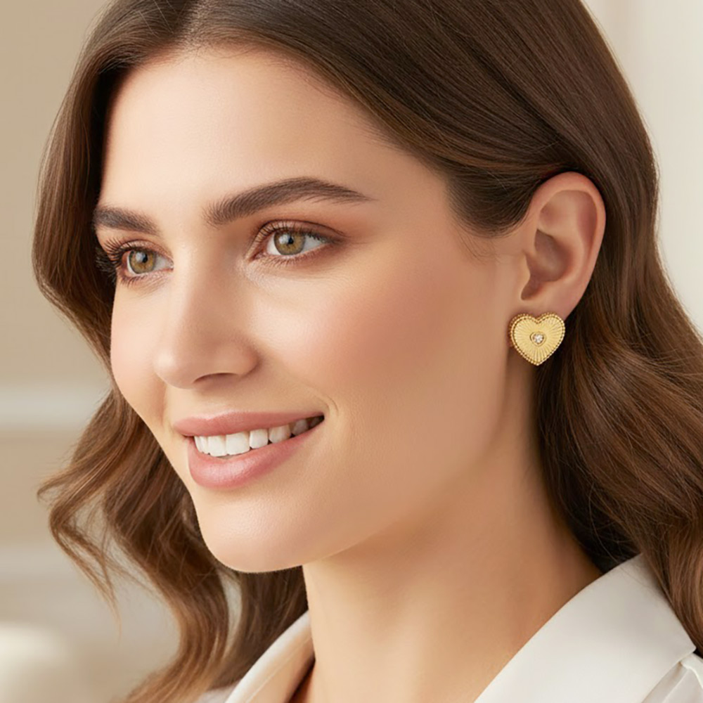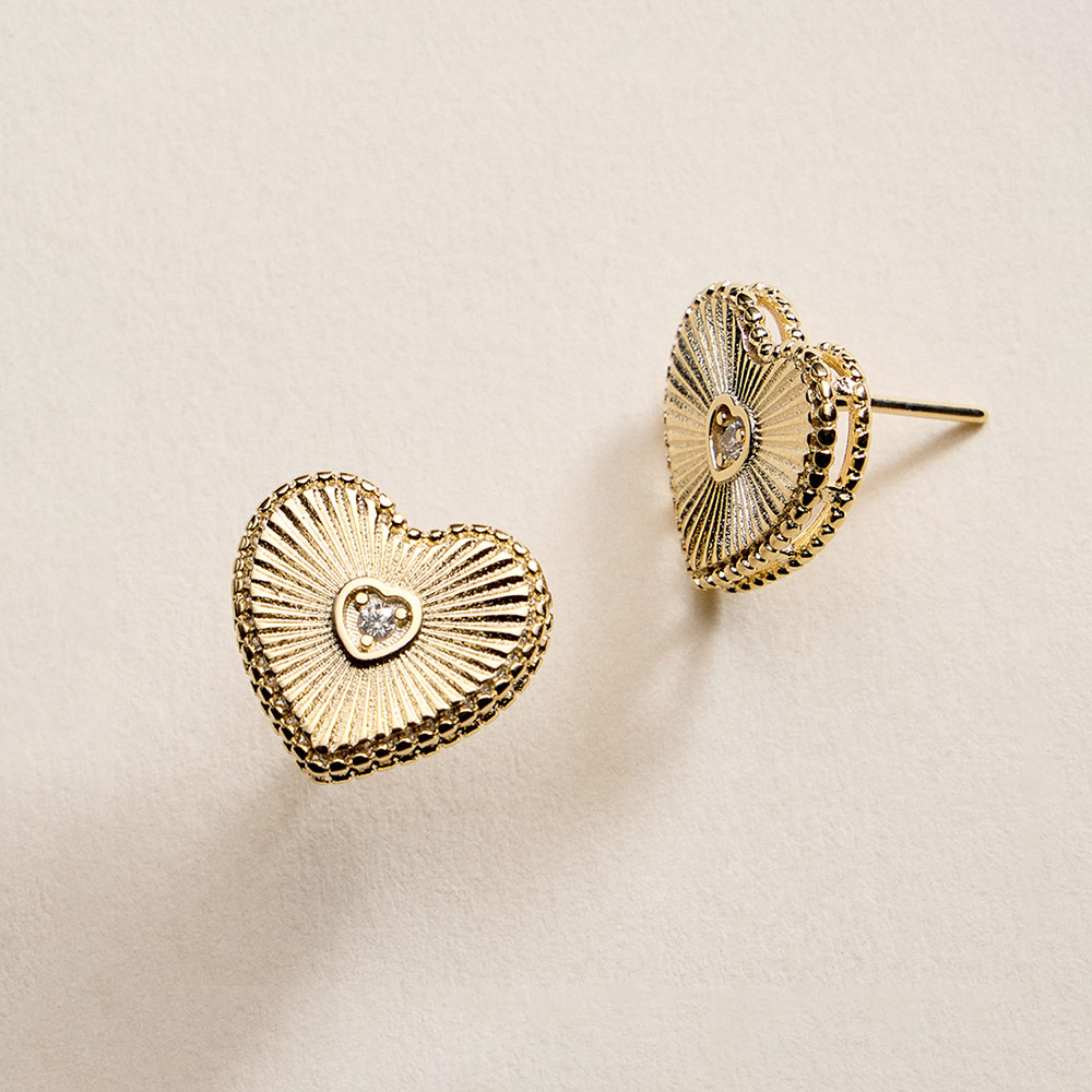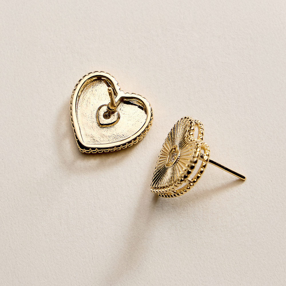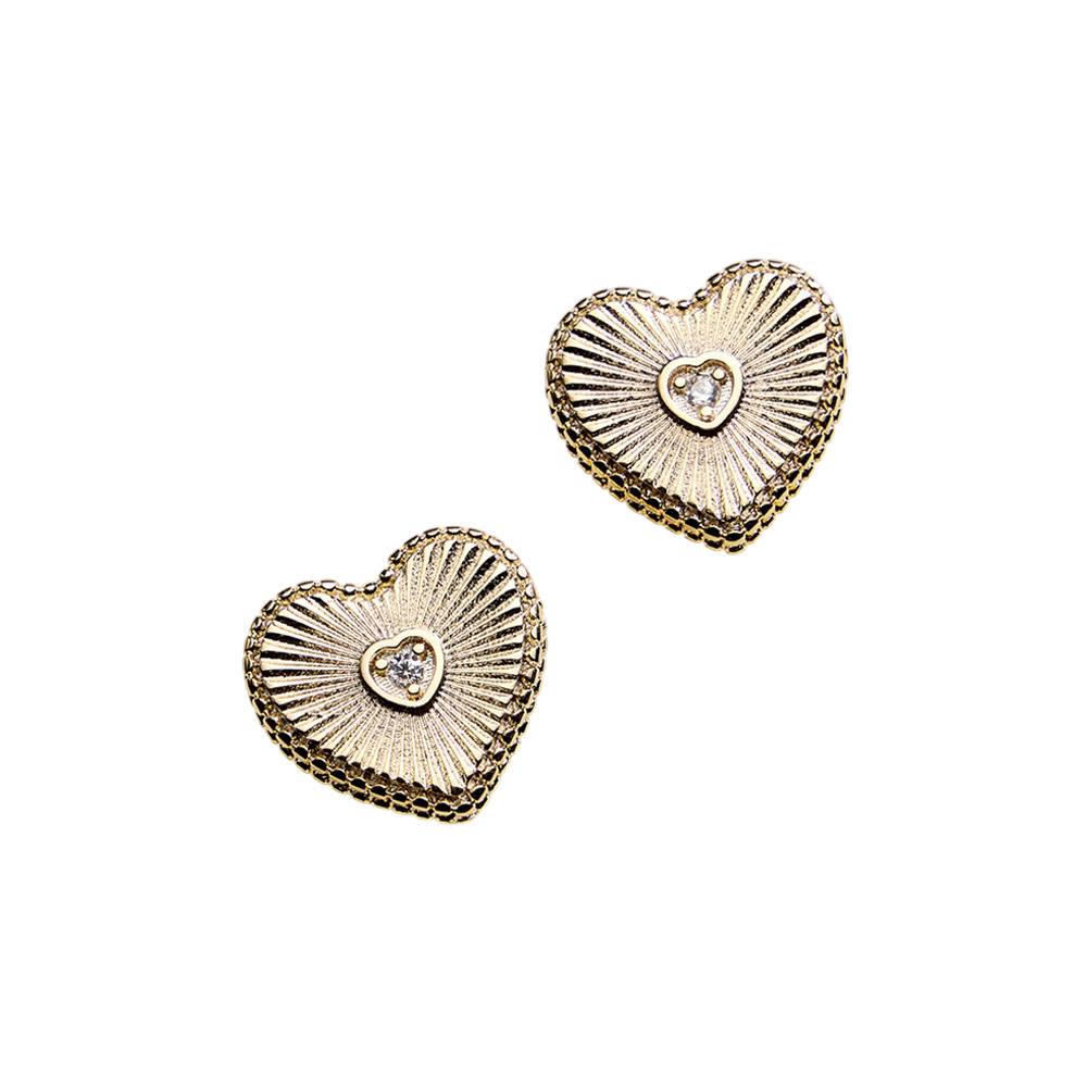 Details • Size : 0.7" X 0.6" • Post Back • Elegant heart stud earrings featuring a detailed textured design with a sparkling CZ center accent. The classic stud silhouette offers comfortable everyday wear while adding a romantic touch. Ideal for gifting, special occasions, or elevating casual and dressy looks. • CZ Cubic Zirconia • Gold Filled • Hypoallergenic • Lead and Nickel Compliant • Made In Brazil