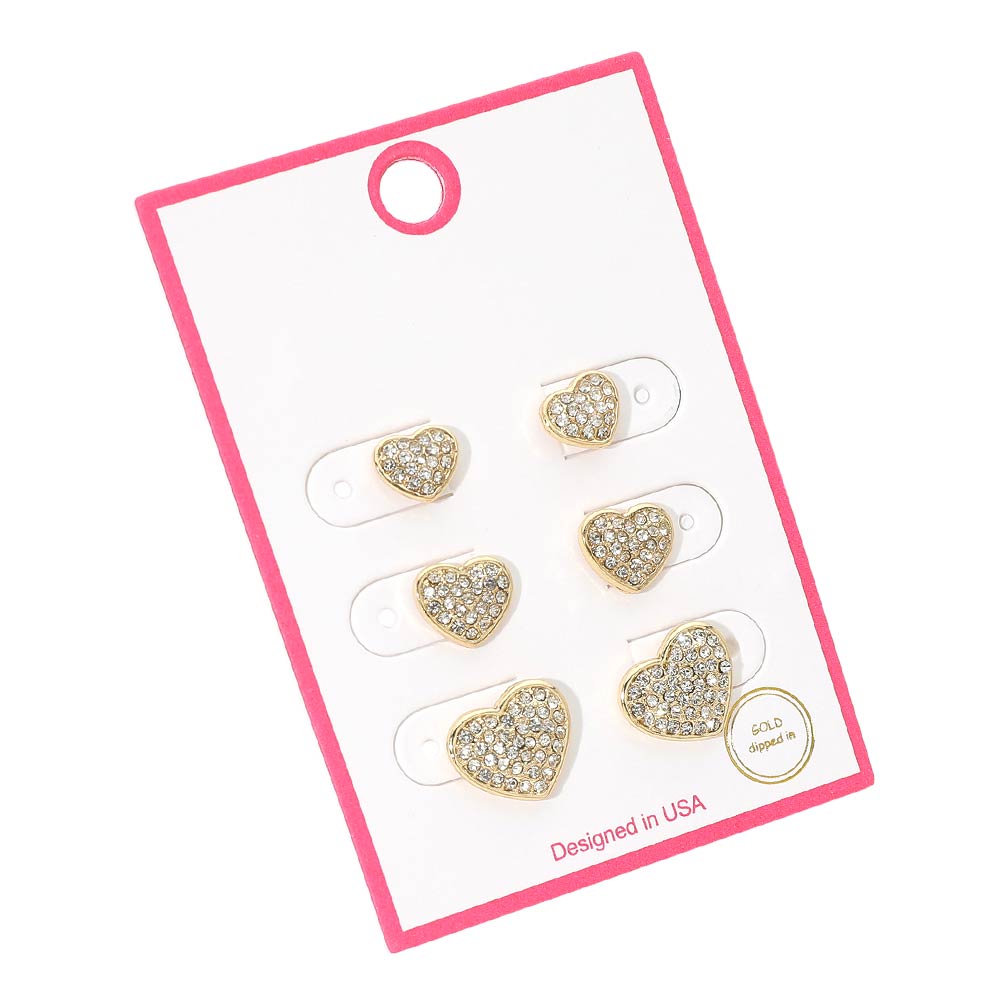3Pairs - Gold Dipped Stone Pave Heart Stud Earring Set