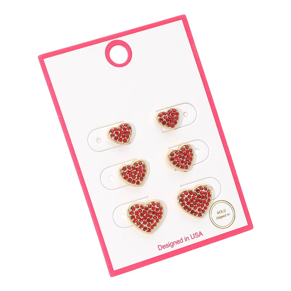 3Pairs - Gold Dipped Stone Pave Heart Stud Earring Set