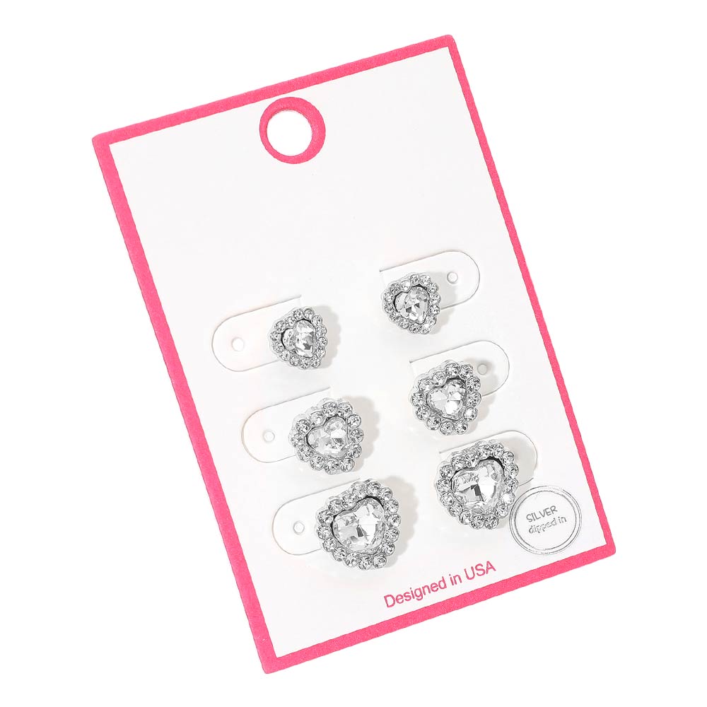 Details • Size : 0.3" - 0.4" L • Post Back • This heart halo stud earring set features multiple heart-shaped designs with sparkling center accents for a polished, elegant look. Perfect for everyday wear, gifting, or boutique displays, these stud earrings offer versatile styling options that easily mix and match for casual, dressy, and special occasion outfits. • Sterling Silver Dipped • Lead and Nickel Compliant