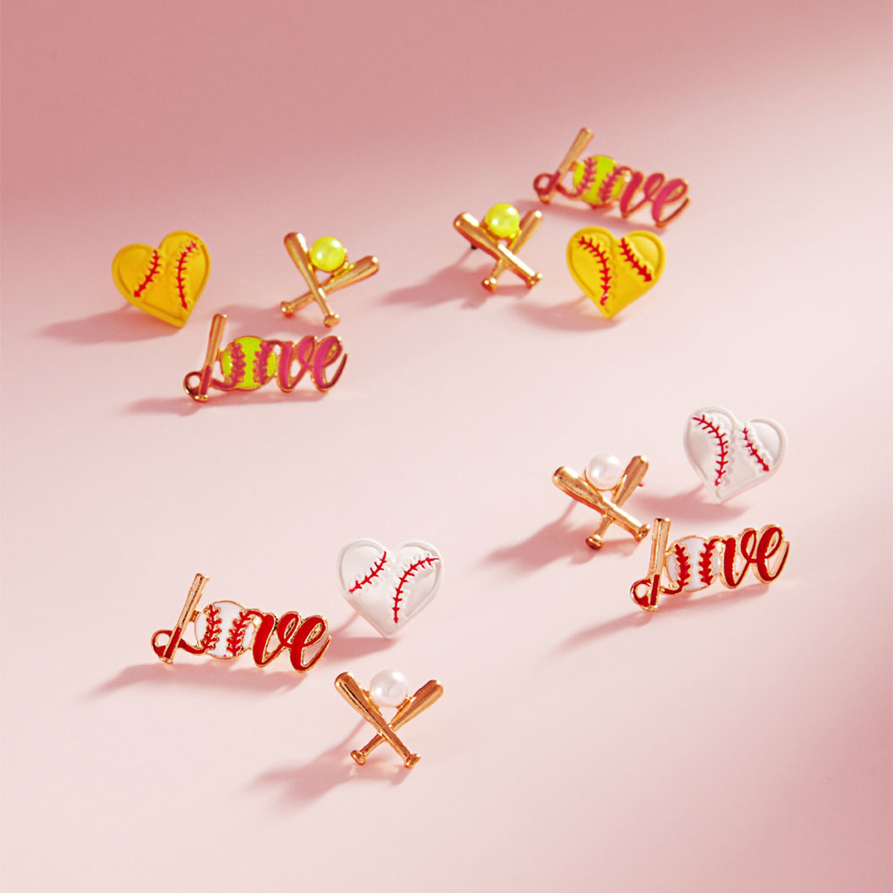 Details • Size : 0.4" L • Titanium Post Back • Sporty stud earring set featuring playful softball-inspired designs including hearts, bats, and script accents for easy mix-and-match styling. Lightweight and comfortable, these studs are perfect for game day outfits, team events, casual wear, and gifting, making them a fun addition to boutique accessory collections. • Lead and Nickel Compliant • Hypoallergenic