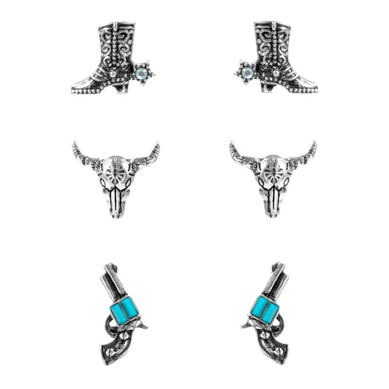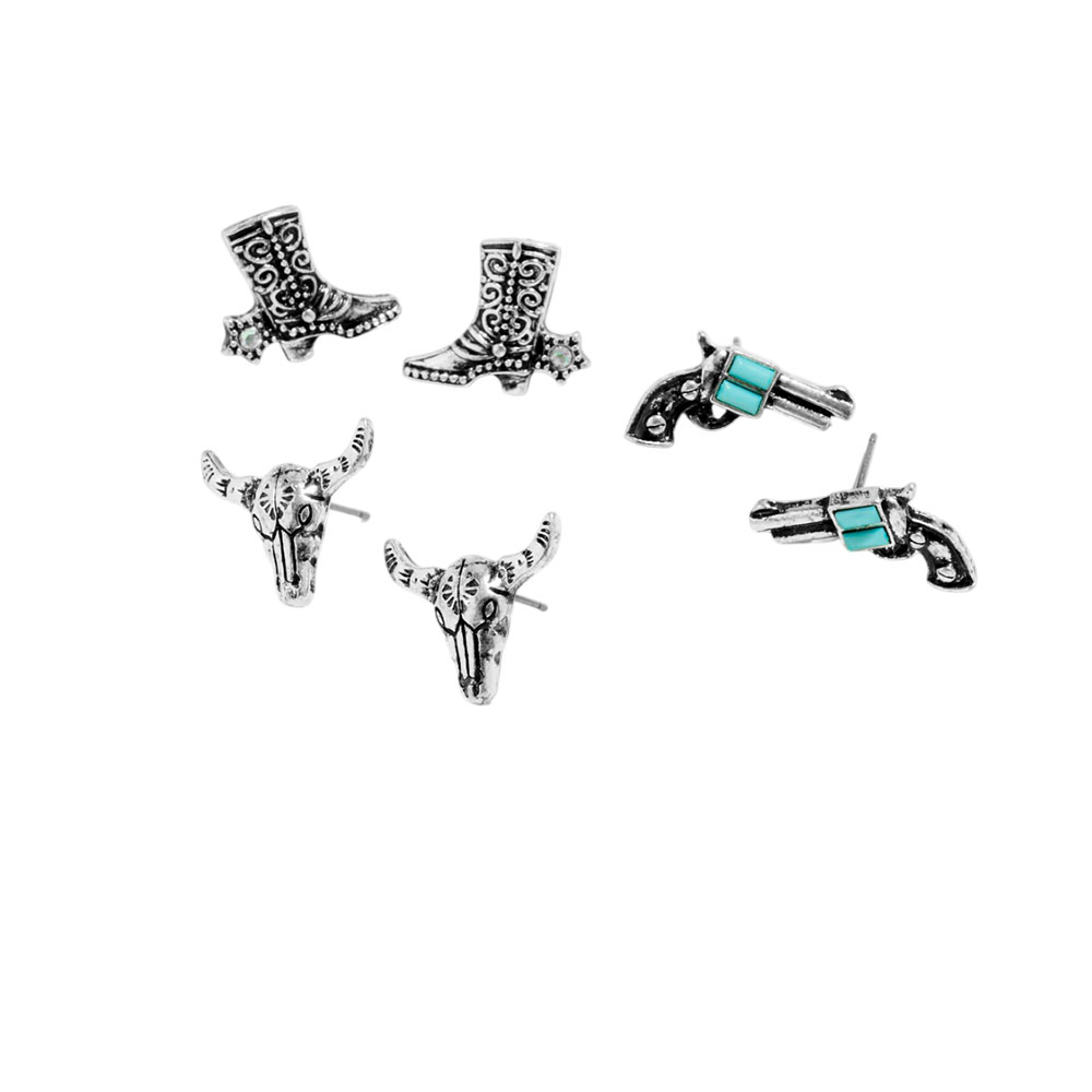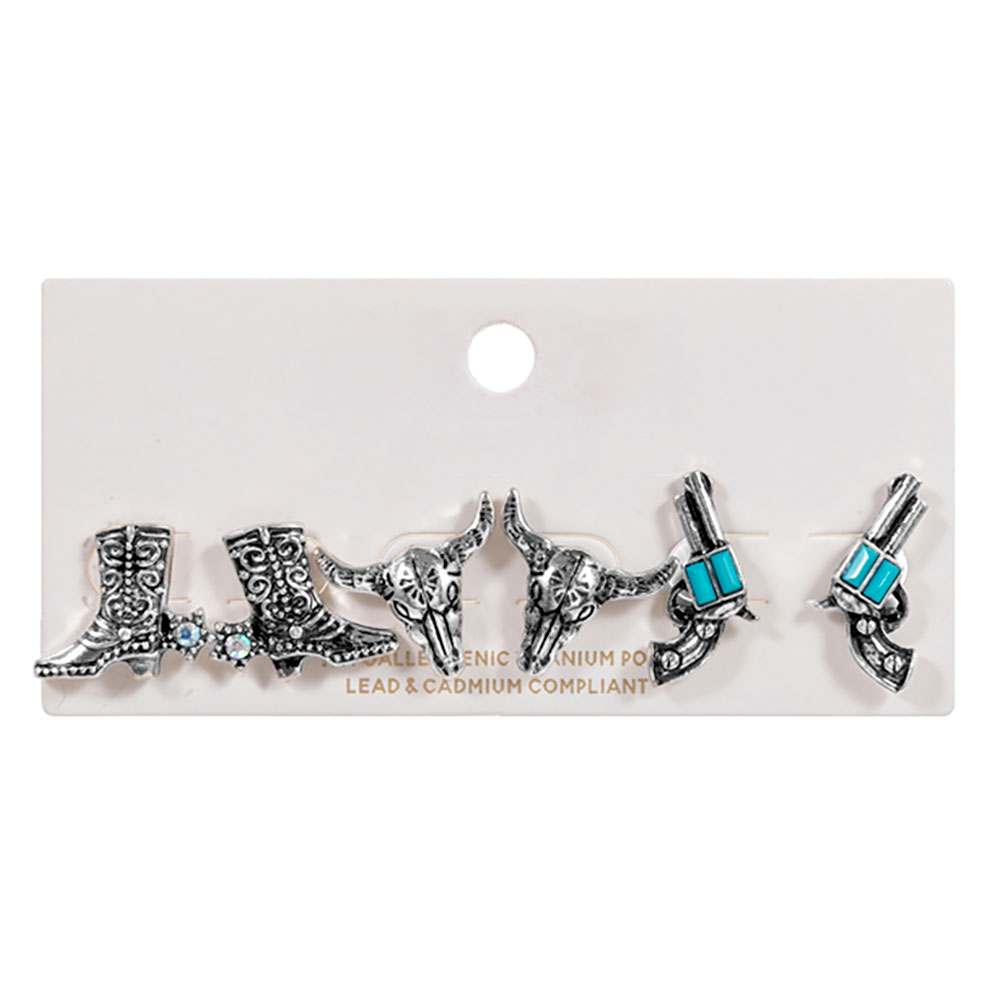 Details • Size : 0.5" - 0.6" L • Titanium Post Back • Three-piece stud earring set showcasing western-inspired icons with engraved detailing for versatile styling. Ideal for mixing and matching across everyday looks, festivals, themed outfits, or statement accessorizing with distinctive charm and playful personality. • Hypoallergenic • Lead and Nickel Compliant