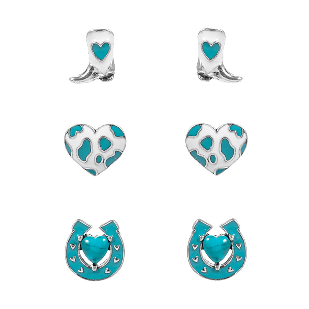 Details • Size : 0.6" L • Titanium Post Back • Three-pair stud earring set featuring heart, boot, and horseshoe motifs designed for easy mix-and-match styling. Perfect for everyday wear or gifting, this coordinated trio offers playful charm and versatile looks, letting you switch up your style with one convenient, themed earring set. • Hypoallergenic • Lead and Nickel Compliant