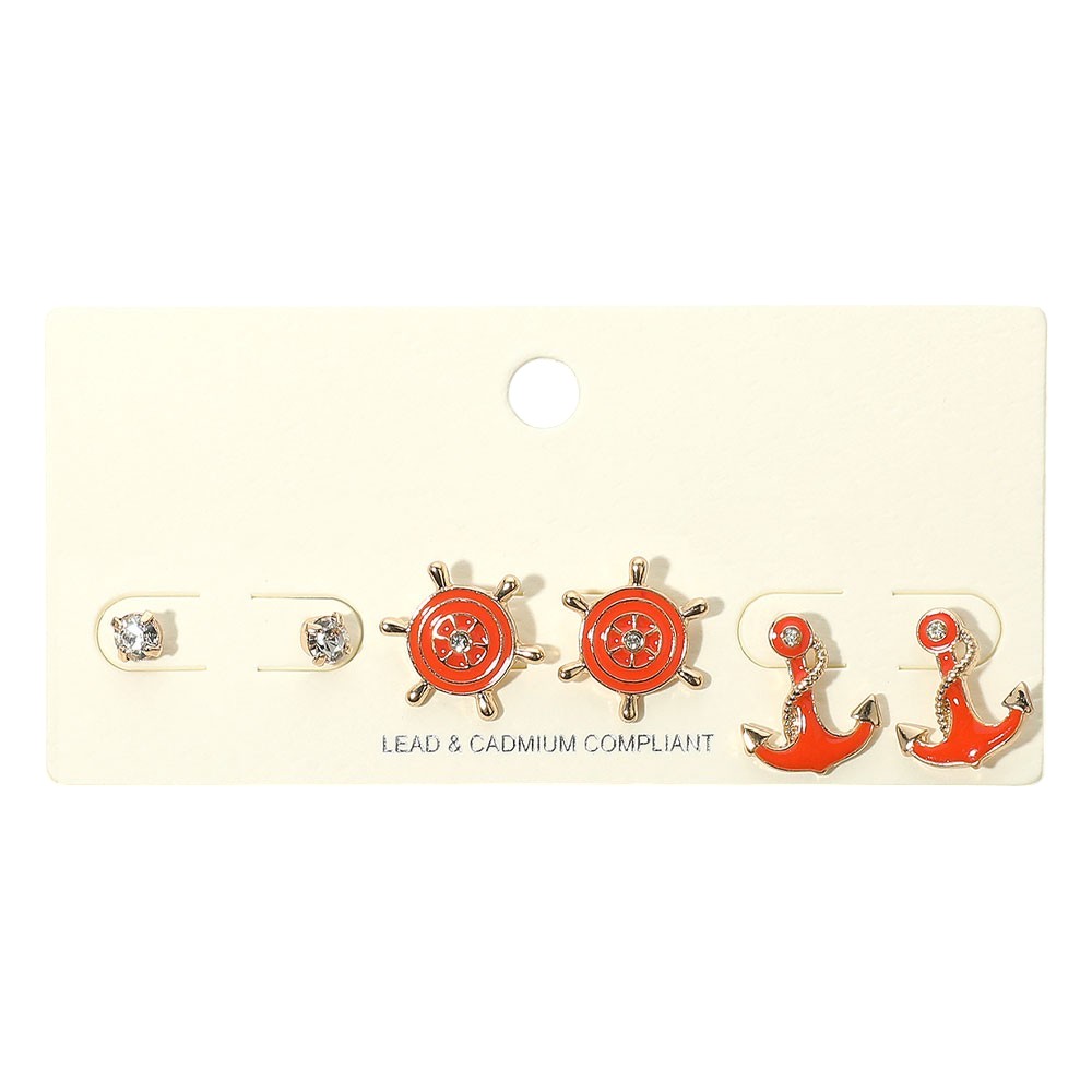 3PCS - Stone Embellished Enamel Ship Wheel Anchor Stud Earring Set