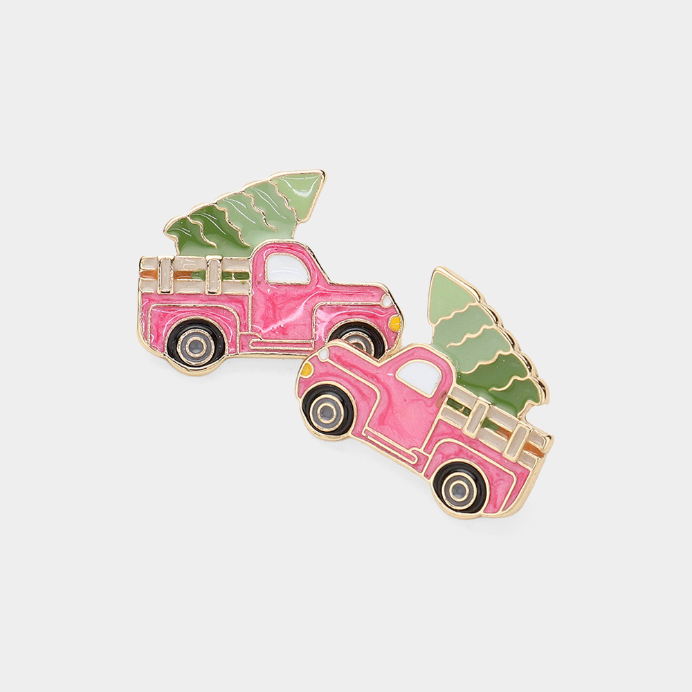 Details • Size : 0.9" X 0.75" • Post Back • Add festive charm to your look with these pickup truck earrings featuring a holiday tree design. Perfect for seasonal parties, gifting, or adding playful cheer to your winter outfits. • Lead and Nickel Compliant