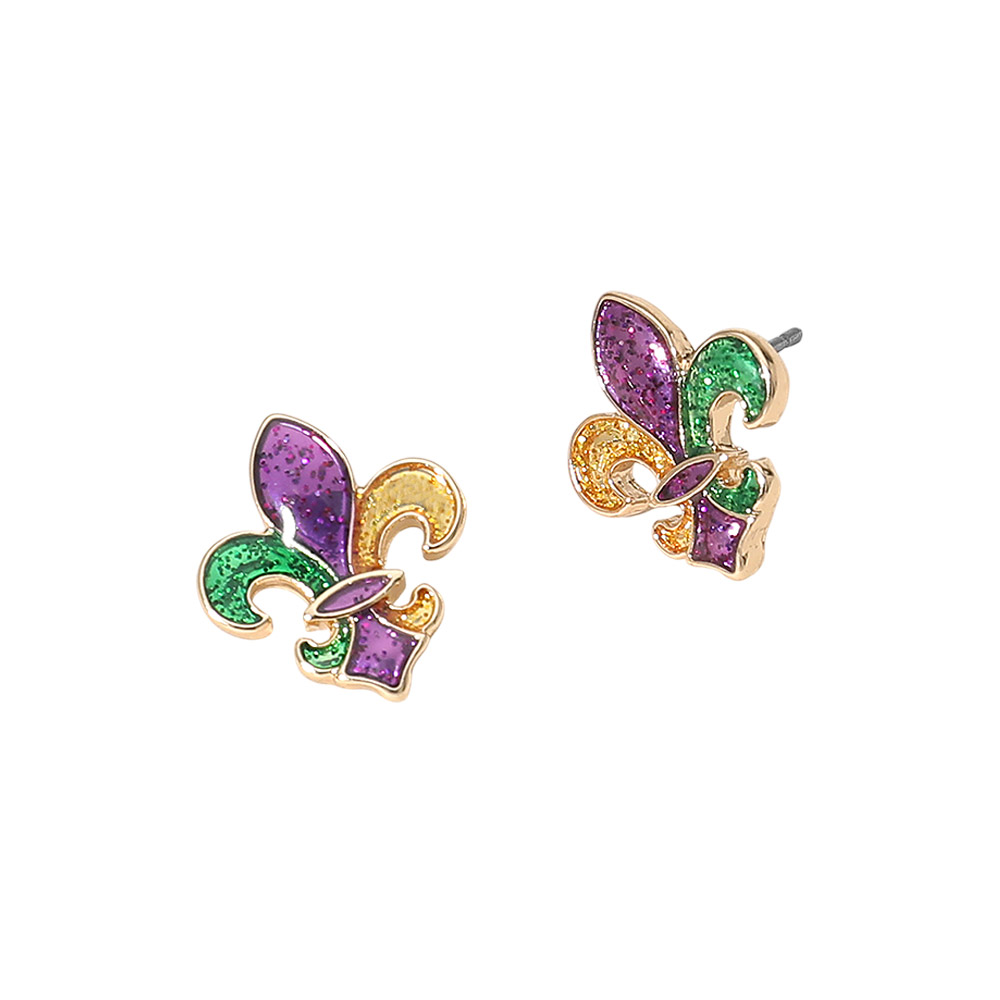• These Mardi Gras fleur de lis stud earrings feature a classic symbolic design made for festive wear and themed events. Ideal for parade outfits, party looks, and seasonal assortments, they offer an easy-to-style accent for celebration jewelry collections, gift shops, and holiday-focused displays while adding iconic flair to everyday or event-ready looks.