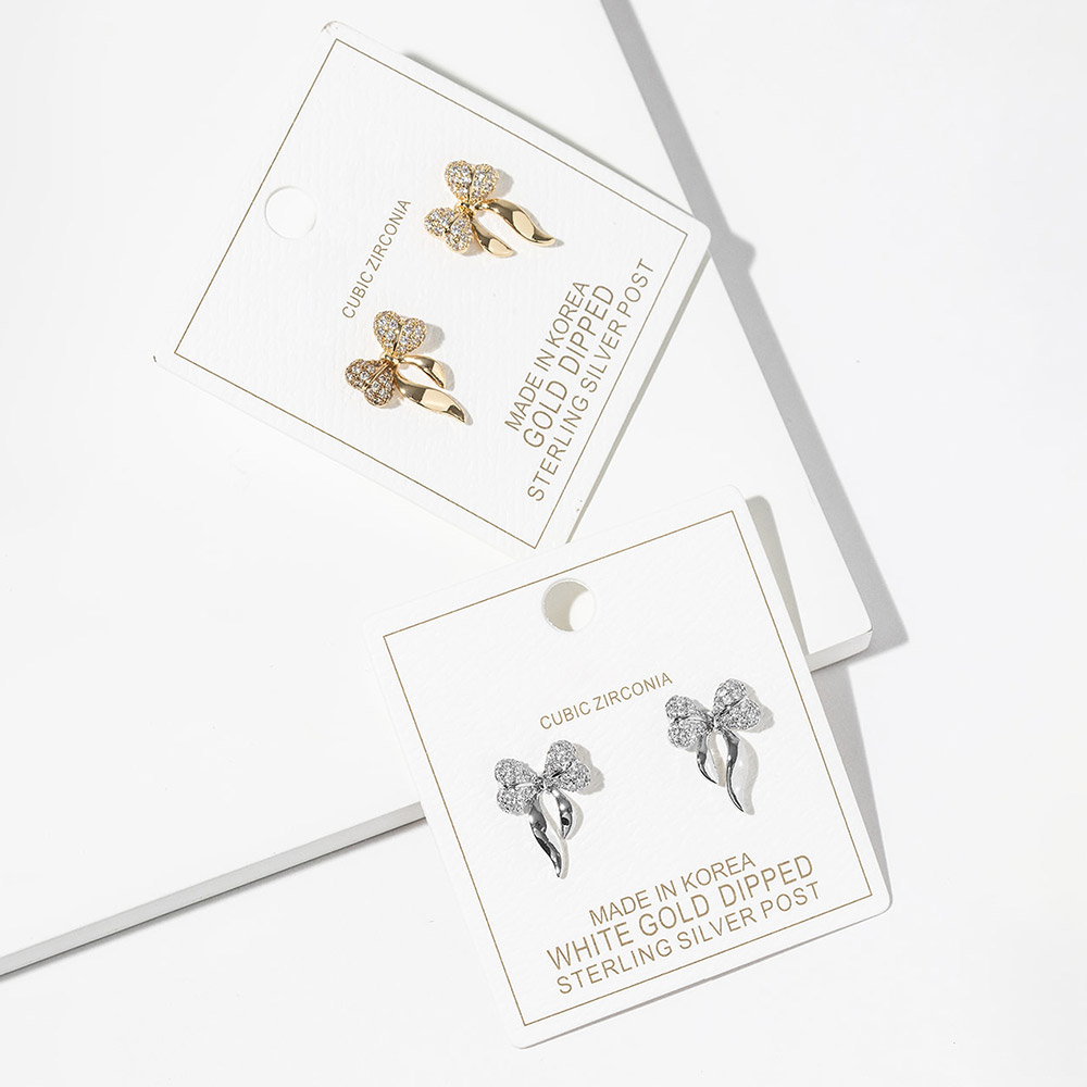White Gold Dipped CZ Stone Paved Bow Stud Earrings