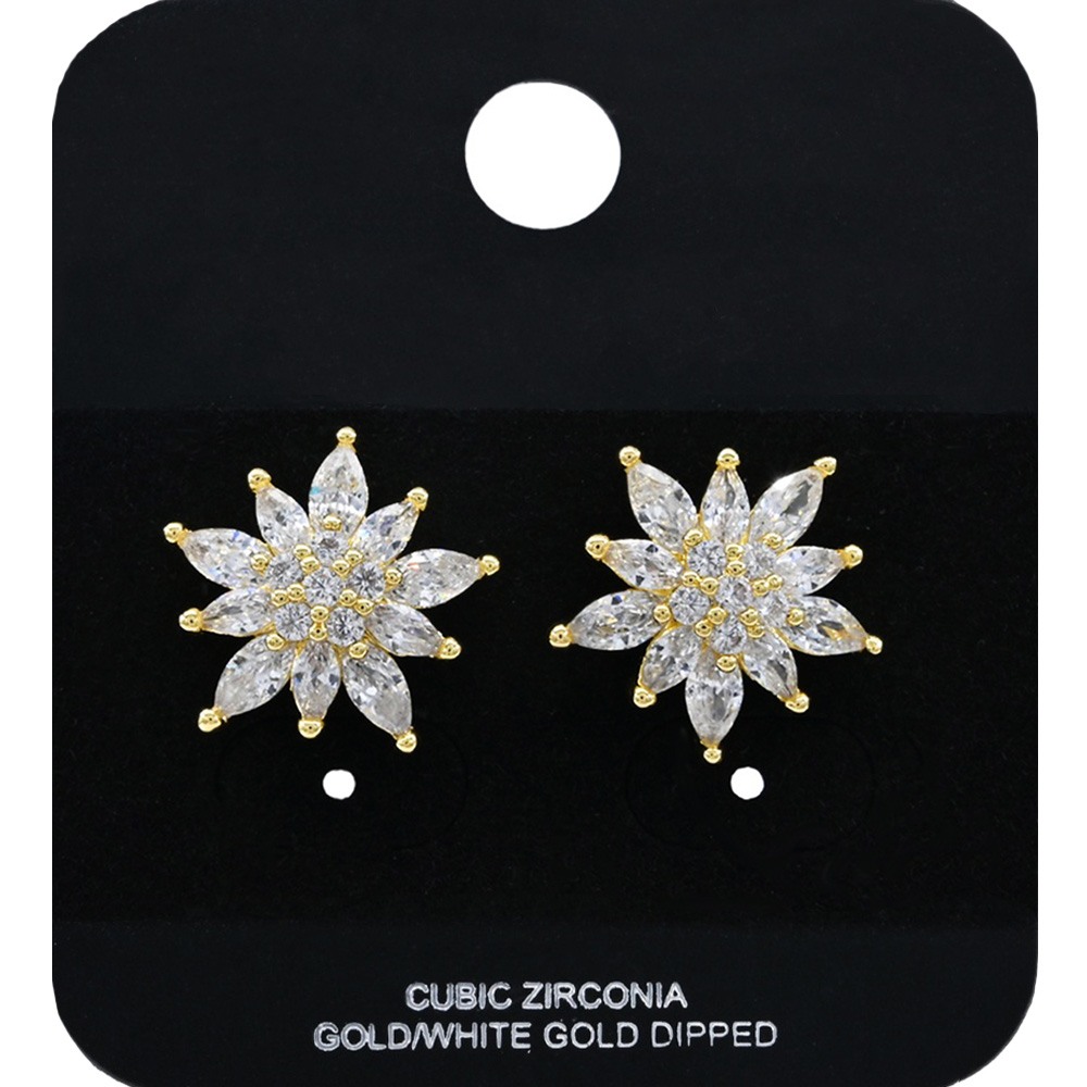 Details • Size : 0.6" X 0.6" • Post Back • These floral cubic zirconia stud earrings feature a brilliant cluster design that radiates timeless elegance. Perfect for adding sparkle to everyday looks or completing special occasion outfits, they offer a refined style that enhances any jewelry collection. • CZ Cubic Zirconia • Gold Dipped • Lead and Nickel Compliant