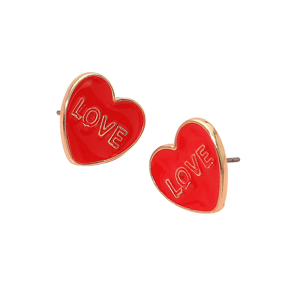 Details • Size : 0.6" X 0.6" • Post Back • Playful heart stud earrings featuring a bold LOVE motif with a sleek, modern silhouette that adds charm and personality to any outfit. Perfect for everyday styling or special moments, these lightweight statement studs bring a fun, romantic touch to both casual and dressed-up looks. • Lead and Nickel Compliant