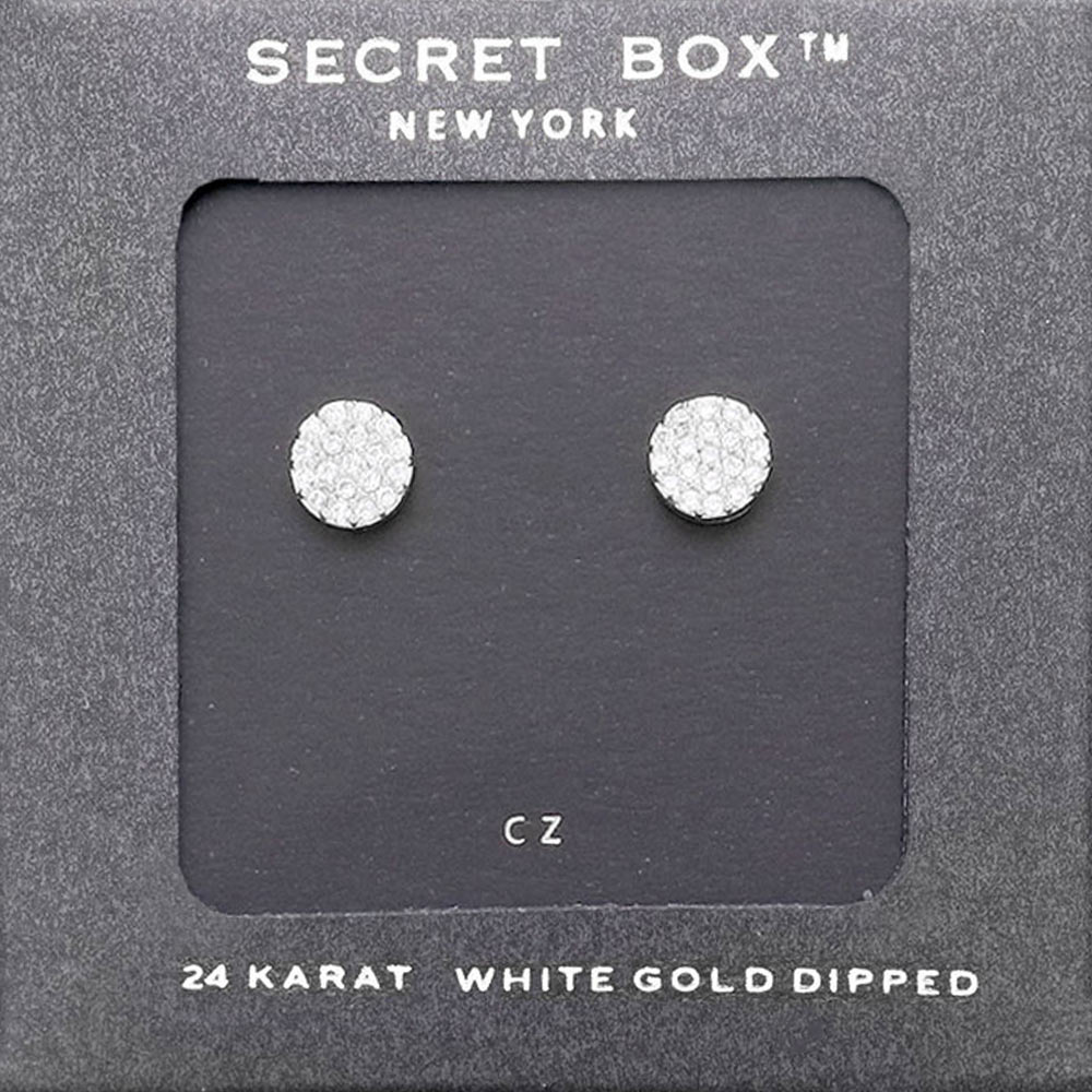 SECRET BOX_ 24K White Gold Dipped CZ Round Stud Earrings