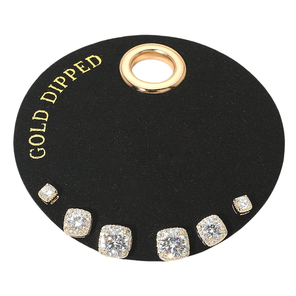 Details • Size : 0.1" - 0.3" L • Post Back • This elegant stud earring set features multiple cushion cut designs in graduated sizes, perfect for everyday wear or special occasions. Designed for comfortable all day use, these versatile studs are ideal for mixing, matching, gifting, or adding refined sparkle to boutique accessory collections. • Gold Dipped
